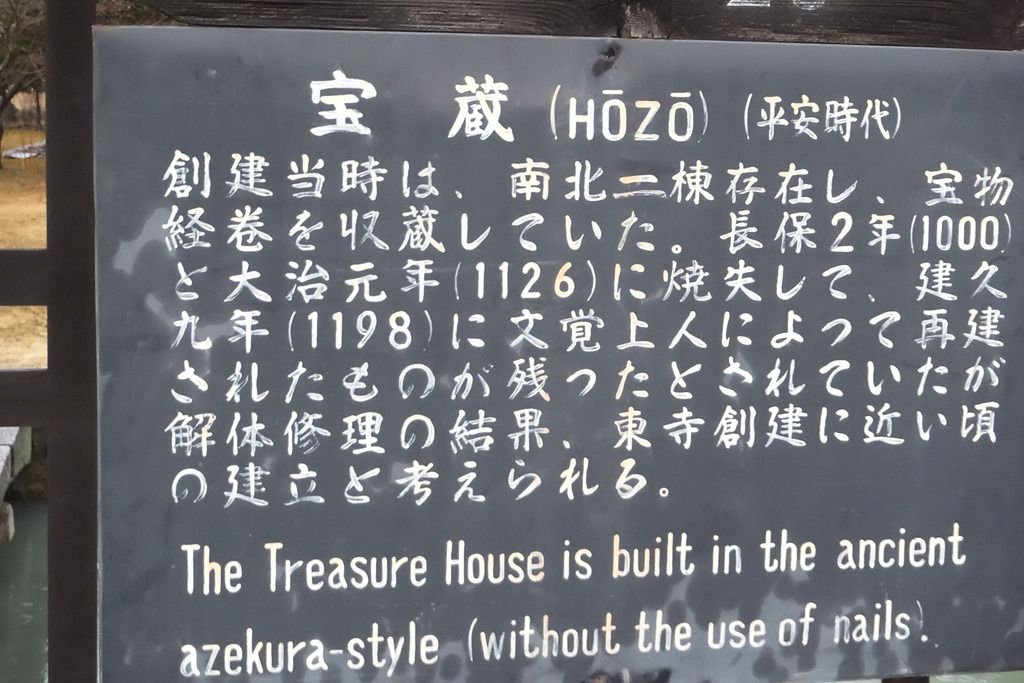 平安時代の建物である宝蔵です。奈良の正倉院と同じ校倉造りです。