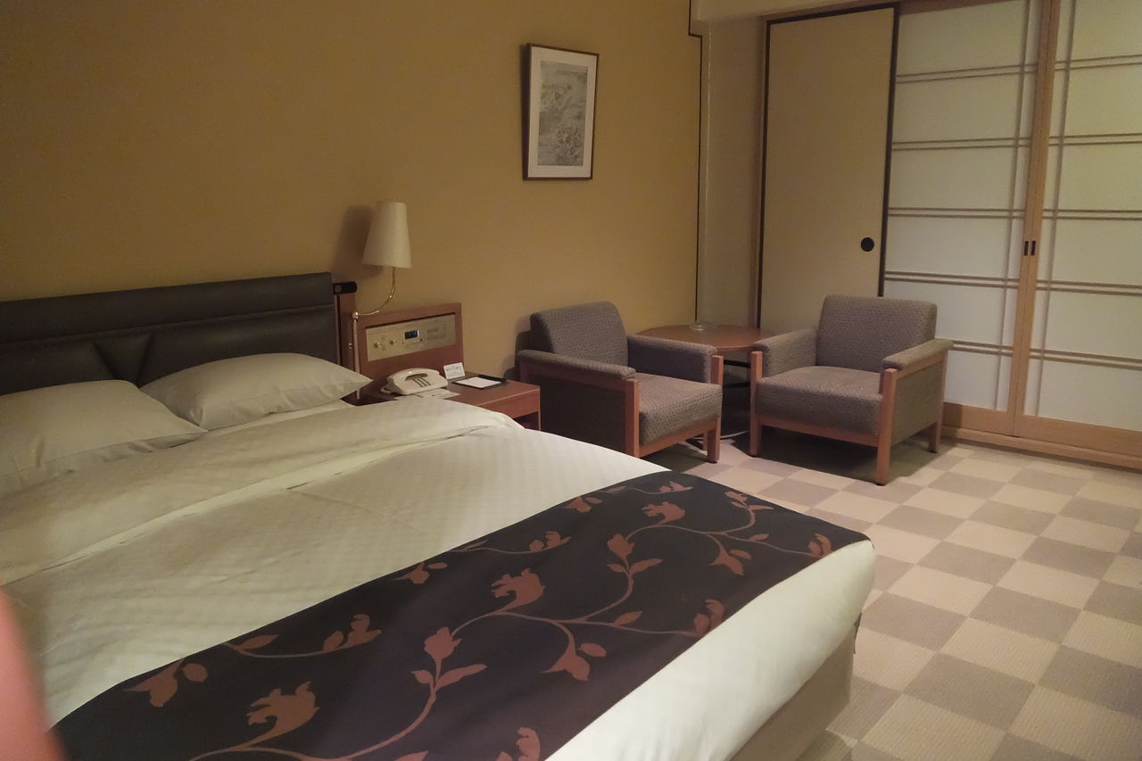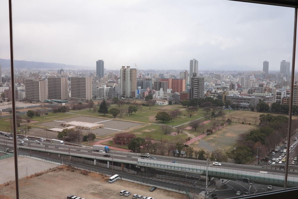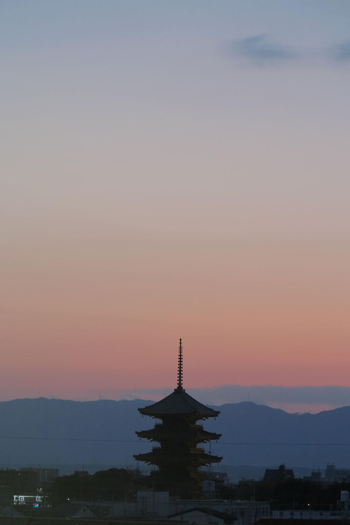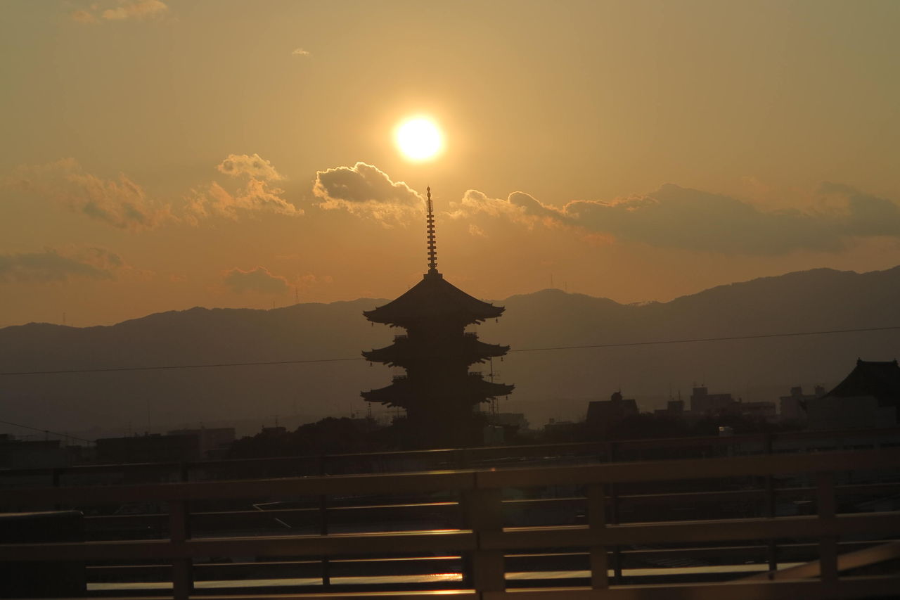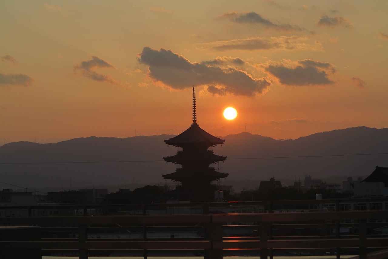 翌朝、部屋から見えた東寺。右手前に新幹線が少しだけ写っています。