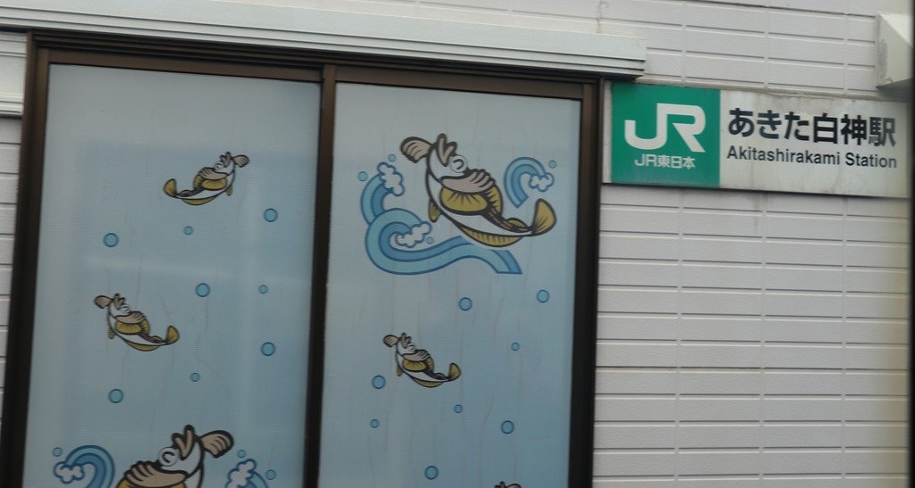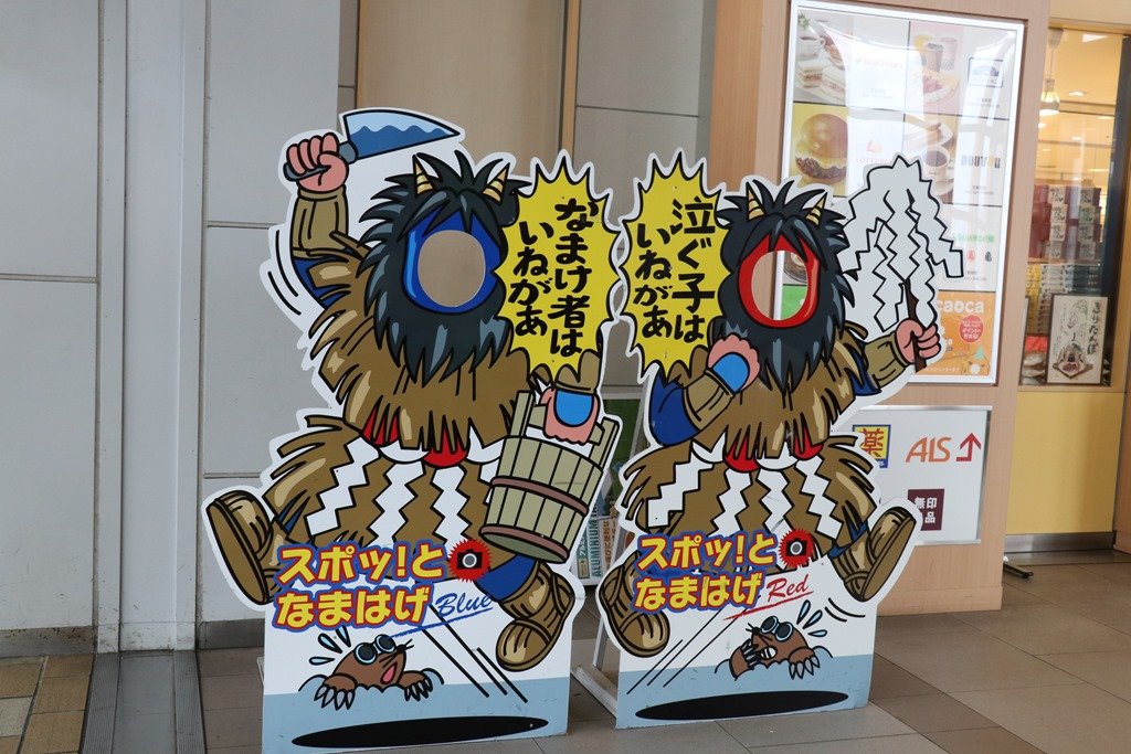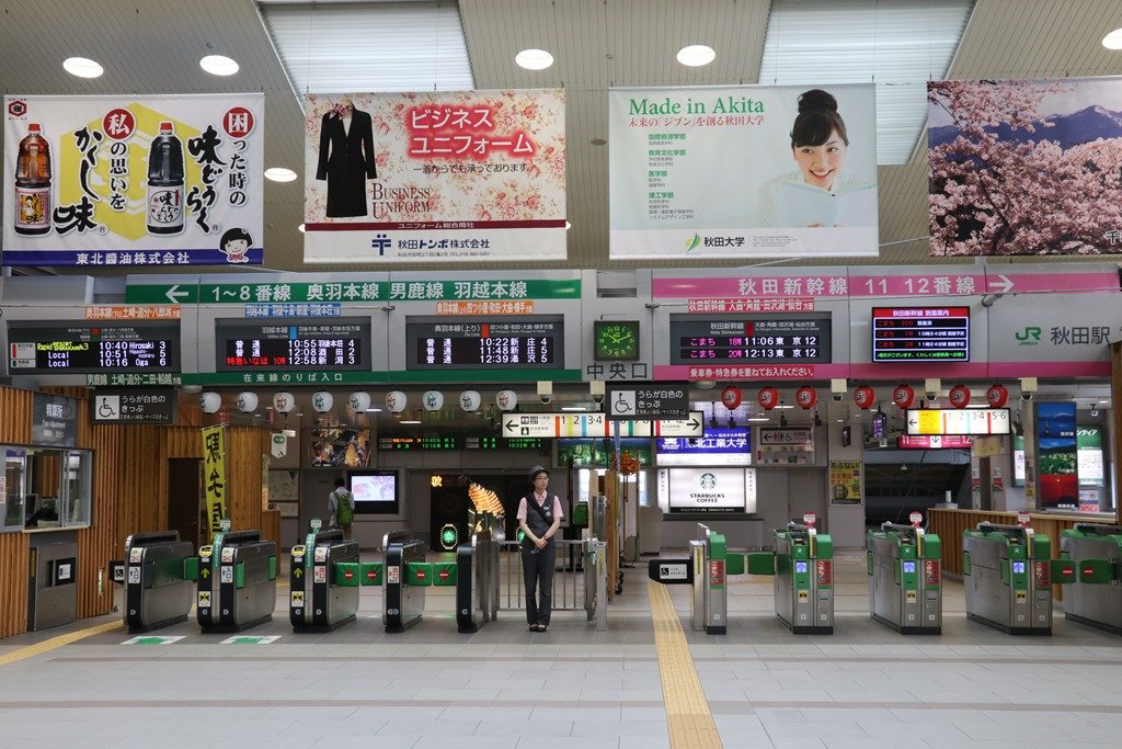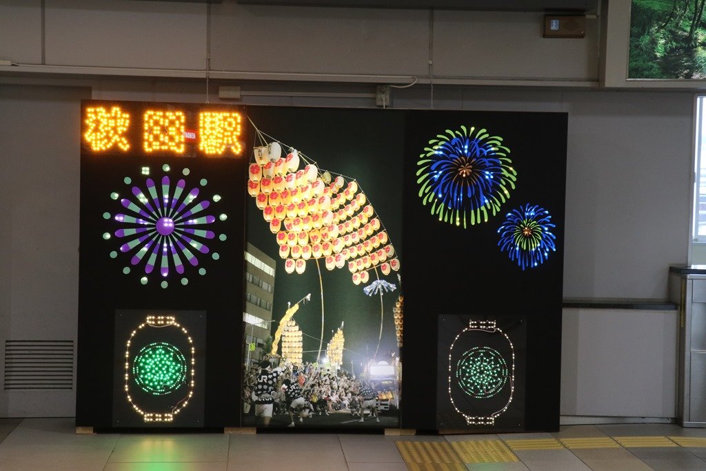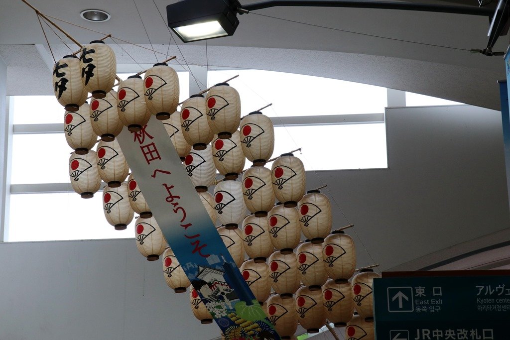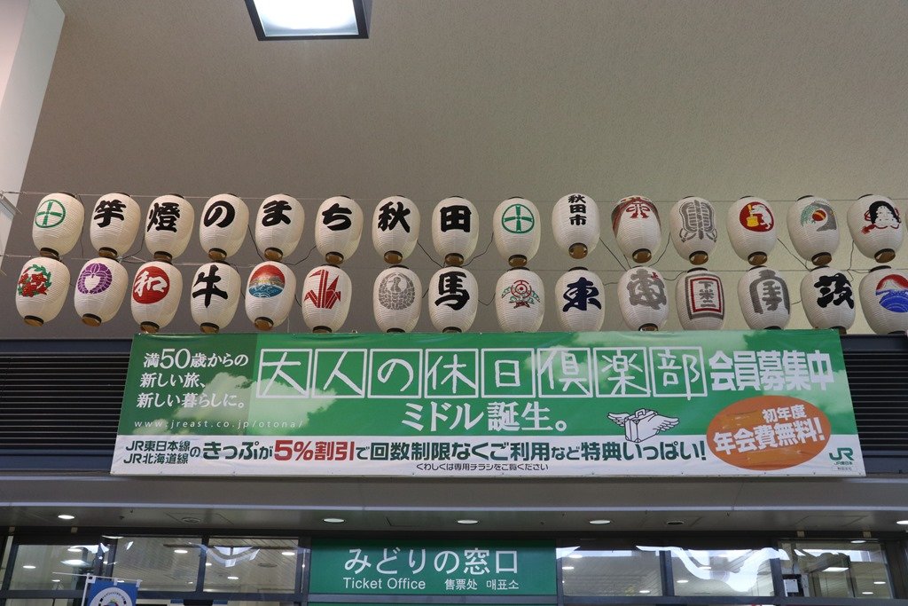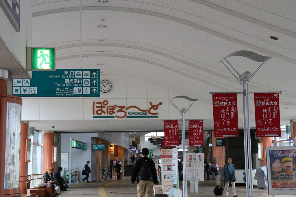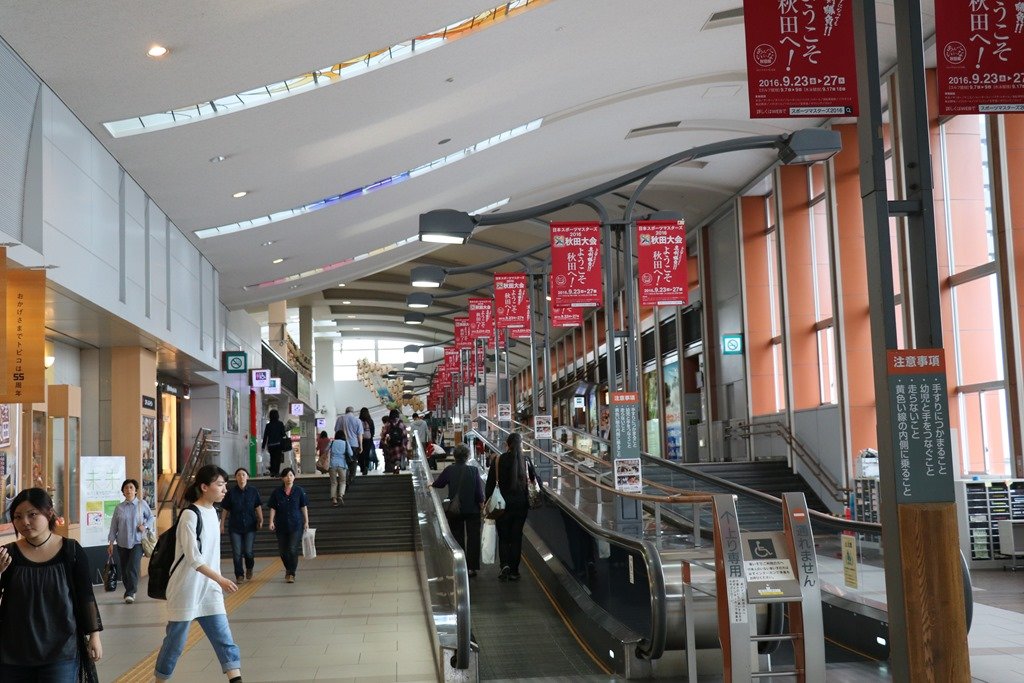 まずは、明日朝に備えてJRの駅を確認です。駅舎は新しく「秋田へようこそ」の赤い旗が列んでいました。