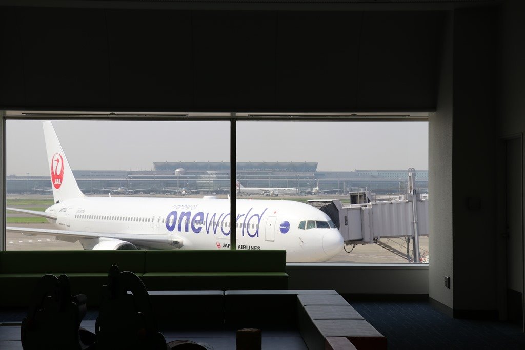 キッズスペースの窓いっぱいに見えるOne World塗装特別機です。