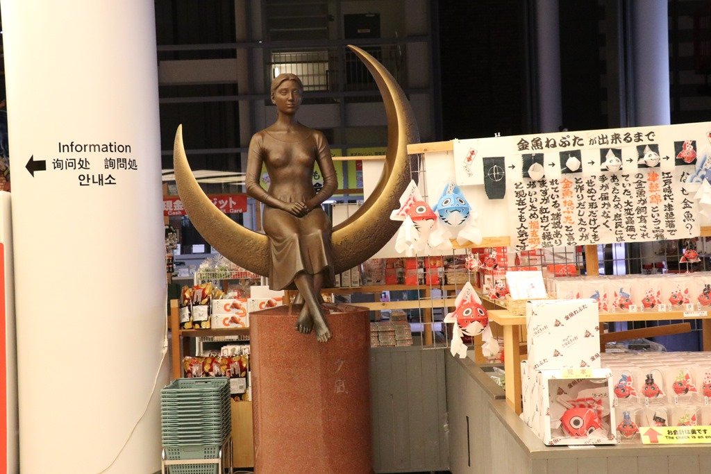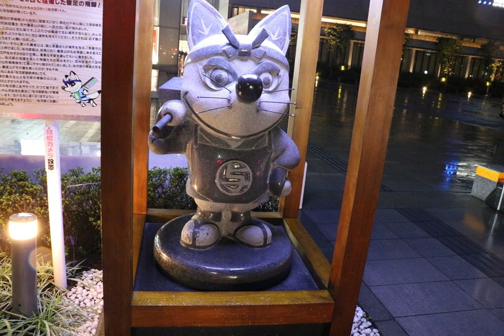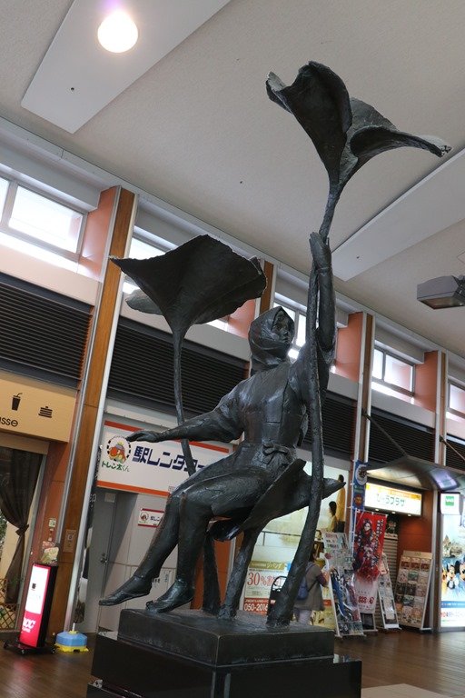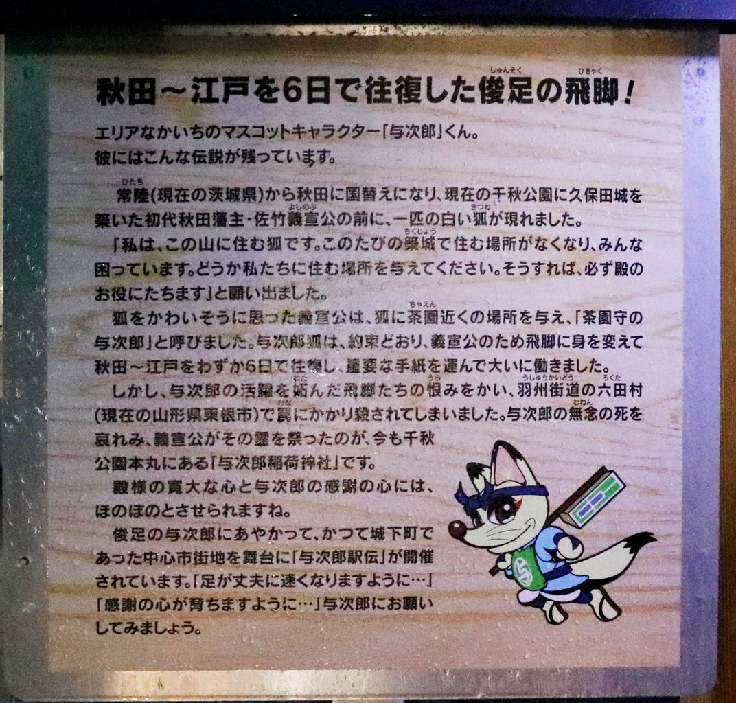広場には飛脚の与次郎狐が居ました。江戸まで6日間で駆けたそうです。この狐は久保田城内での与次郎稲荷伝説によるもので、エリアなかいちのマスコットになっていました。