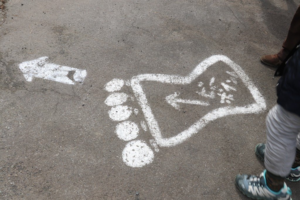 駐車場の地面に大きな足跡が描かれ矢印がありました。