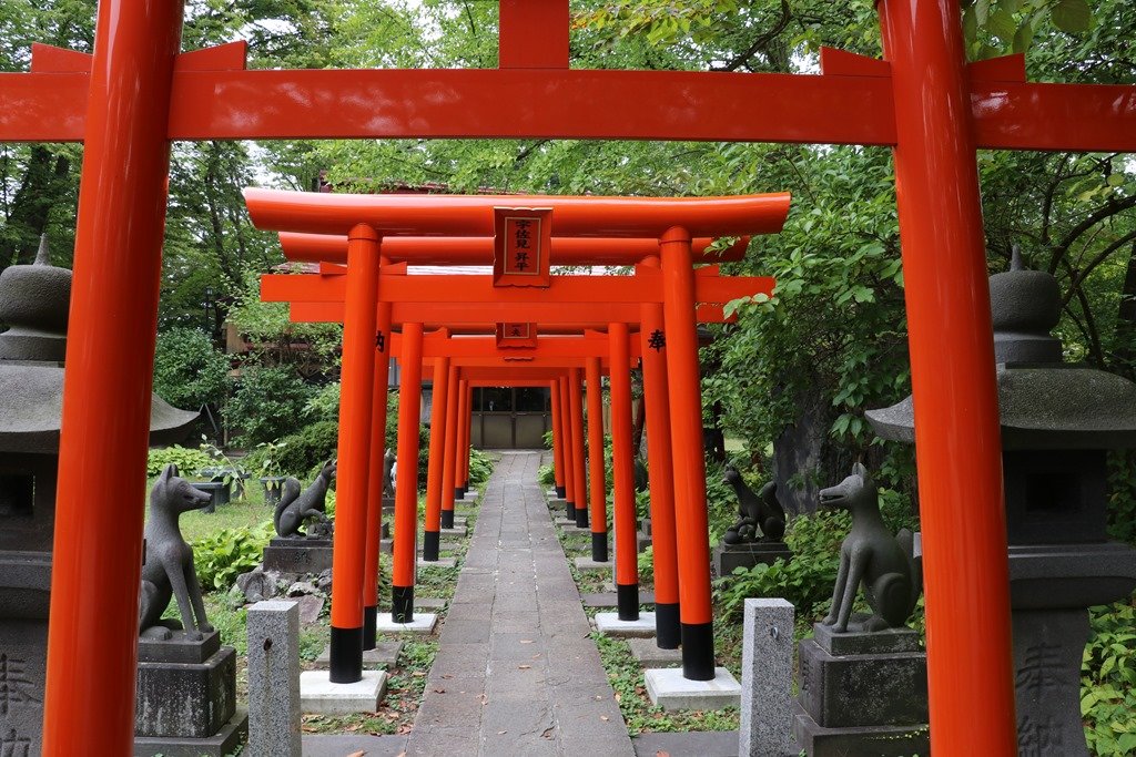 赤い鳥居をくぐって行くと左右に多くの狐の像があり、口に何かくわえているものが多いです。