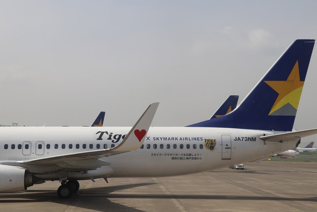スカイマークの機体にTaigerと入り、「スカイマークでタイガースを応援しよう 関西の窓口 神戸空港」と小さく書かれています。写真を拡大するとよくわかります。