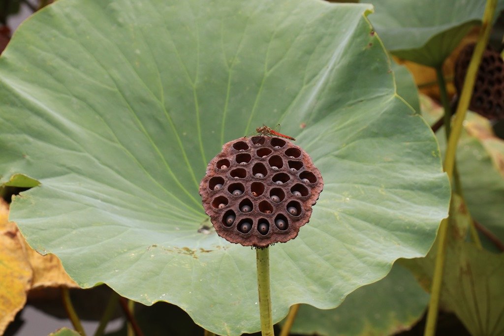 蓮のレンコンに羽を休める赤とんぼ!秋ですね。