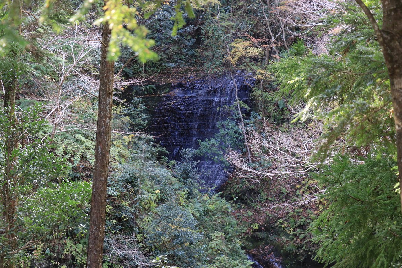 岩を伝わり流れ落ちるセイワナの滝です。木の間に見えました。