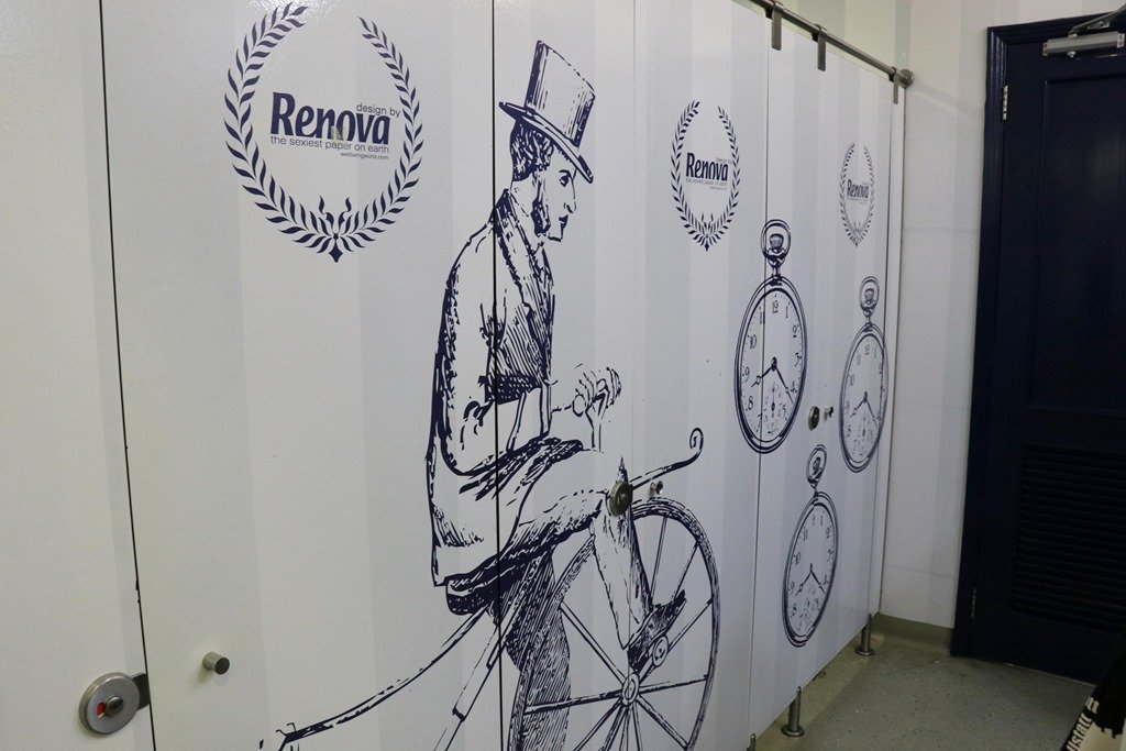 トイレの前に洒落た絵が描かれていました。山高帽をかぶり昔の自転車に乗る男性と懐中時計は開店時を表現しているのでしょうか?
