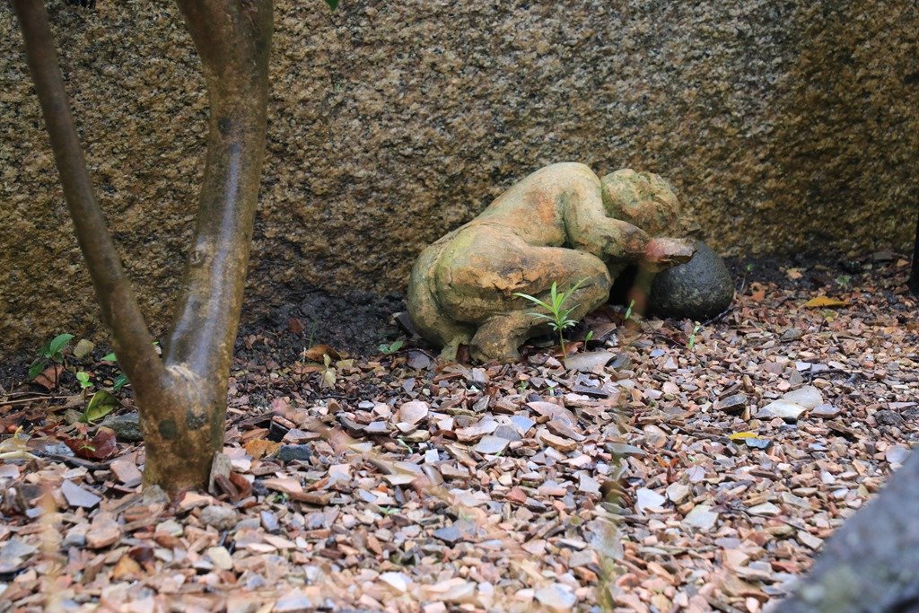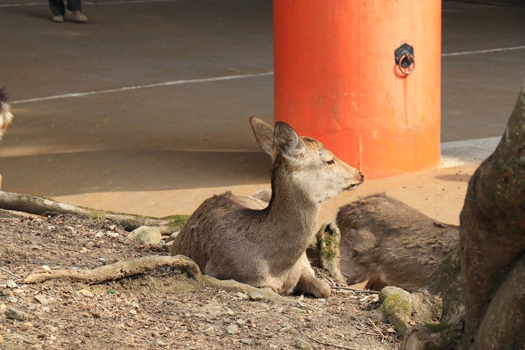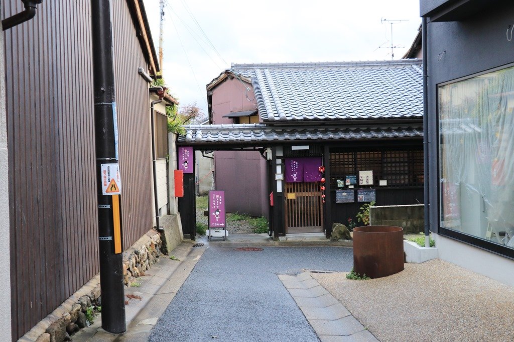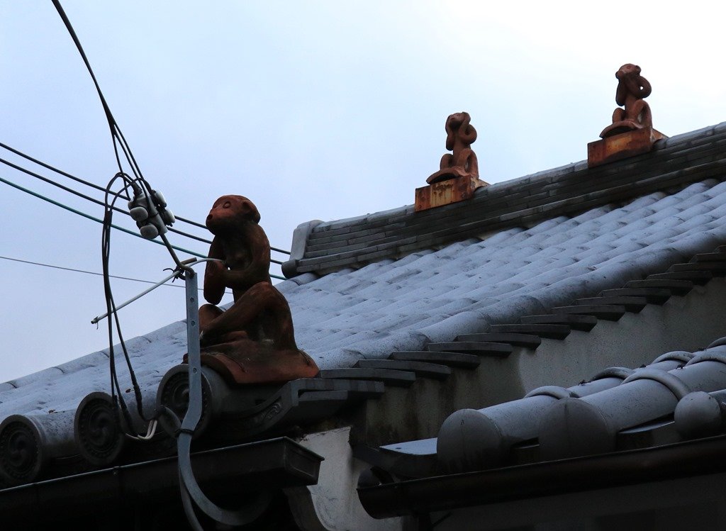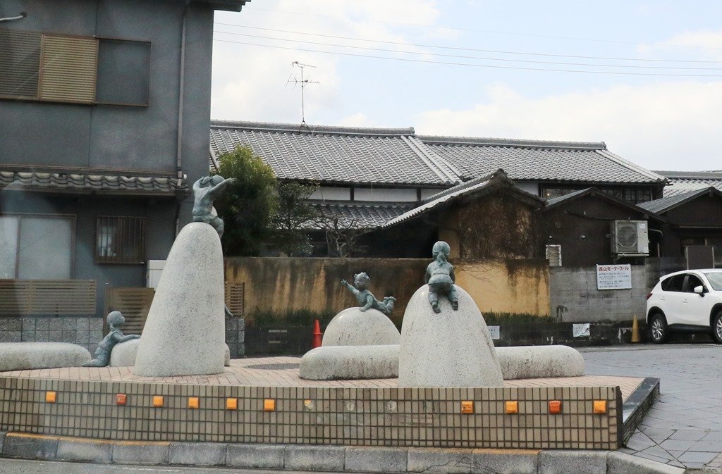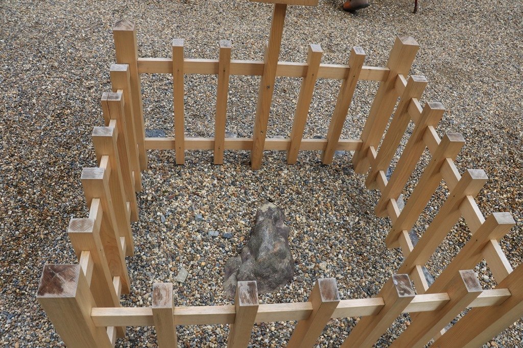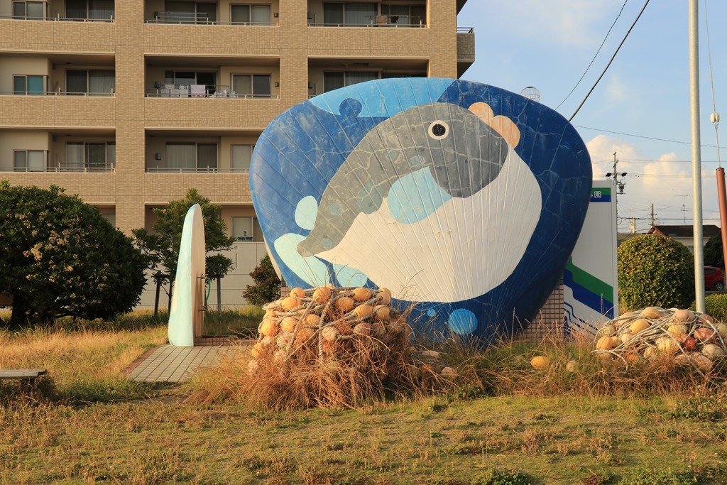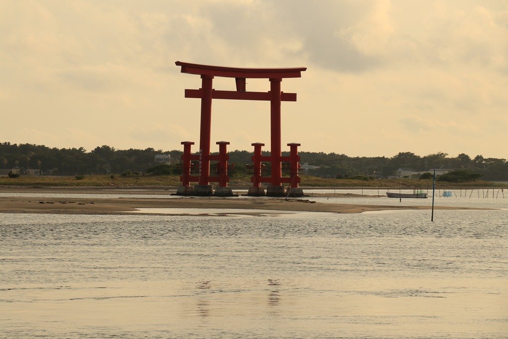 鳥居に夕日が沈むのを見られるのは魚のモニュメントがある場所です。