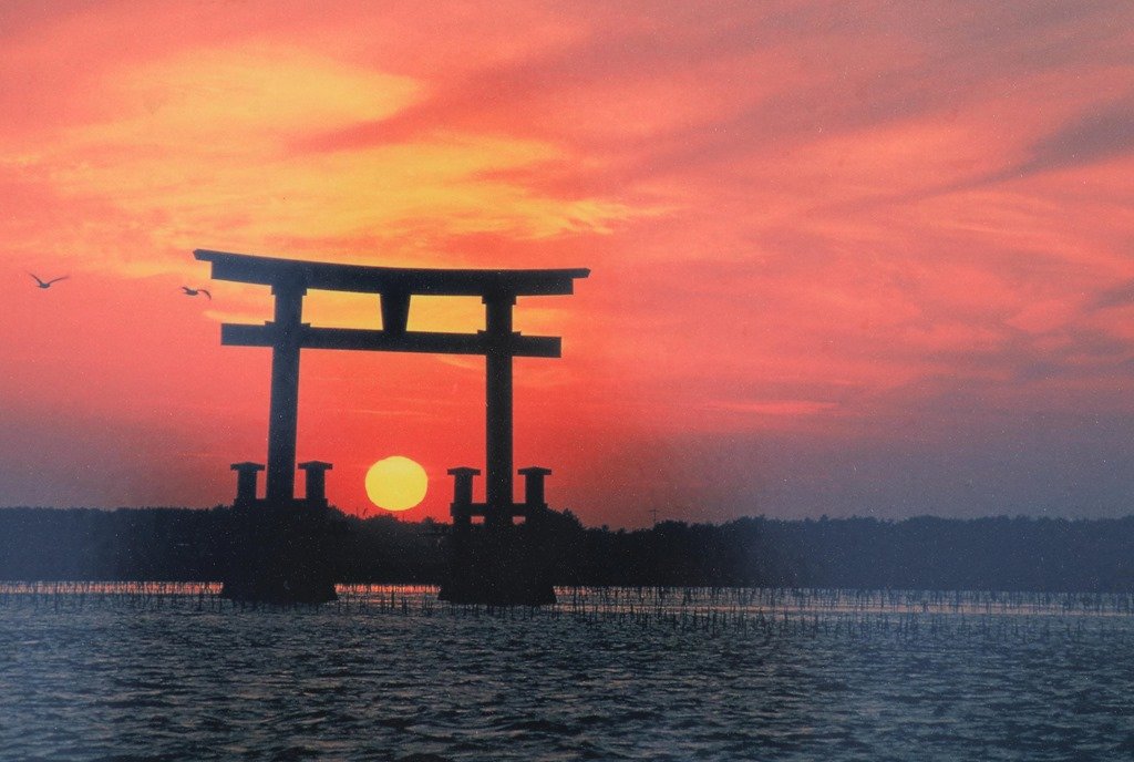 このような夕焼けを見たかったのですが、11月〜3月の冬の間しか太陽が鳥居に沈みません。6月は鳥居のはるか右に沈みました。