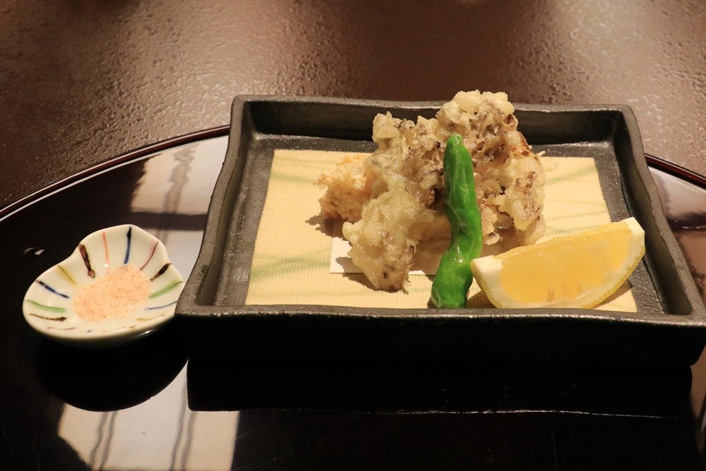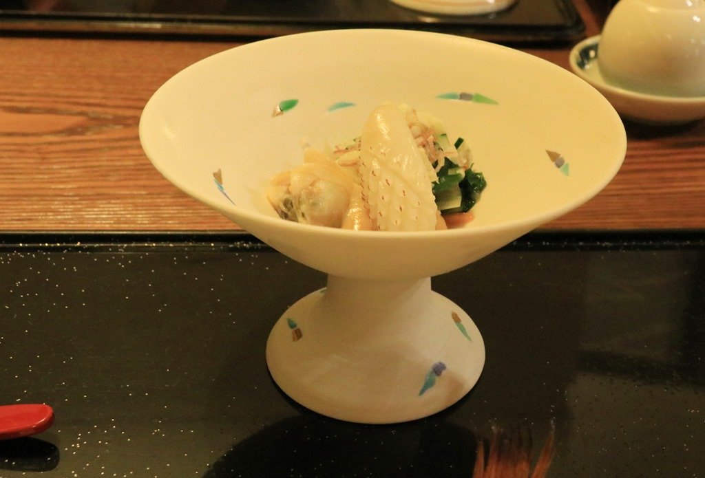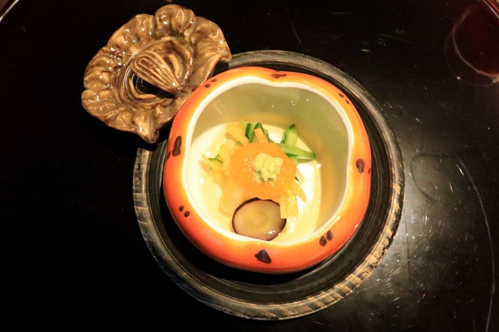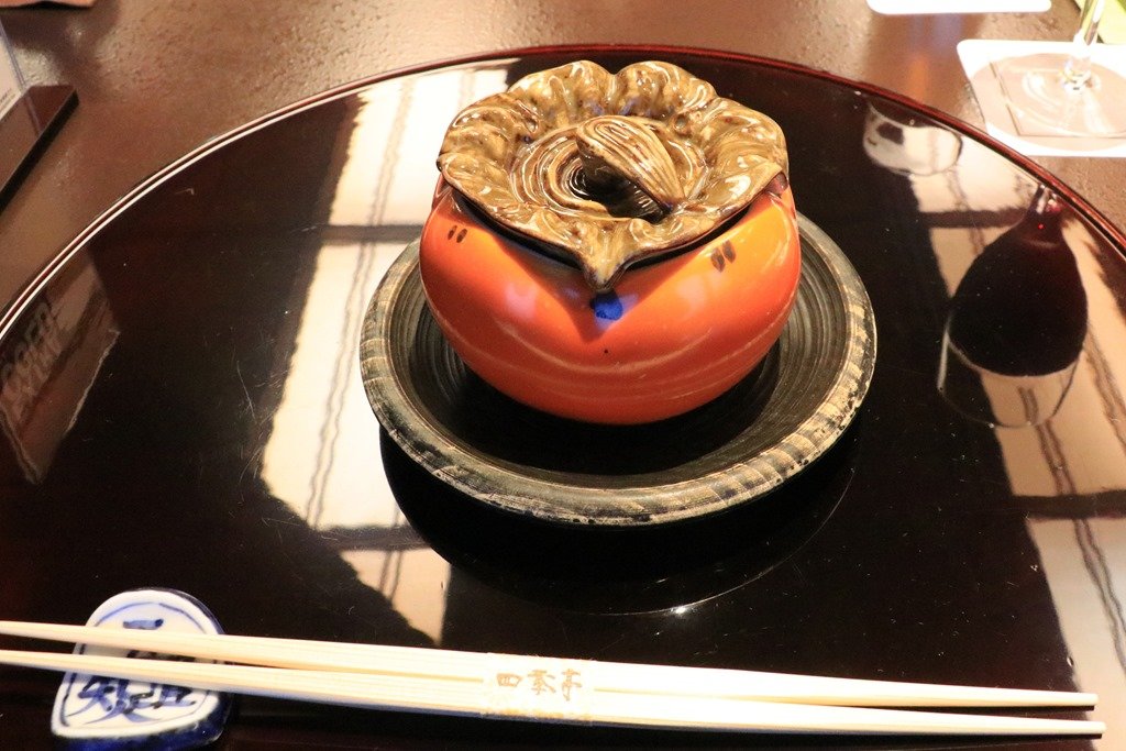 「先付け」は「柿なます」で柿の形をした容器で出されました。