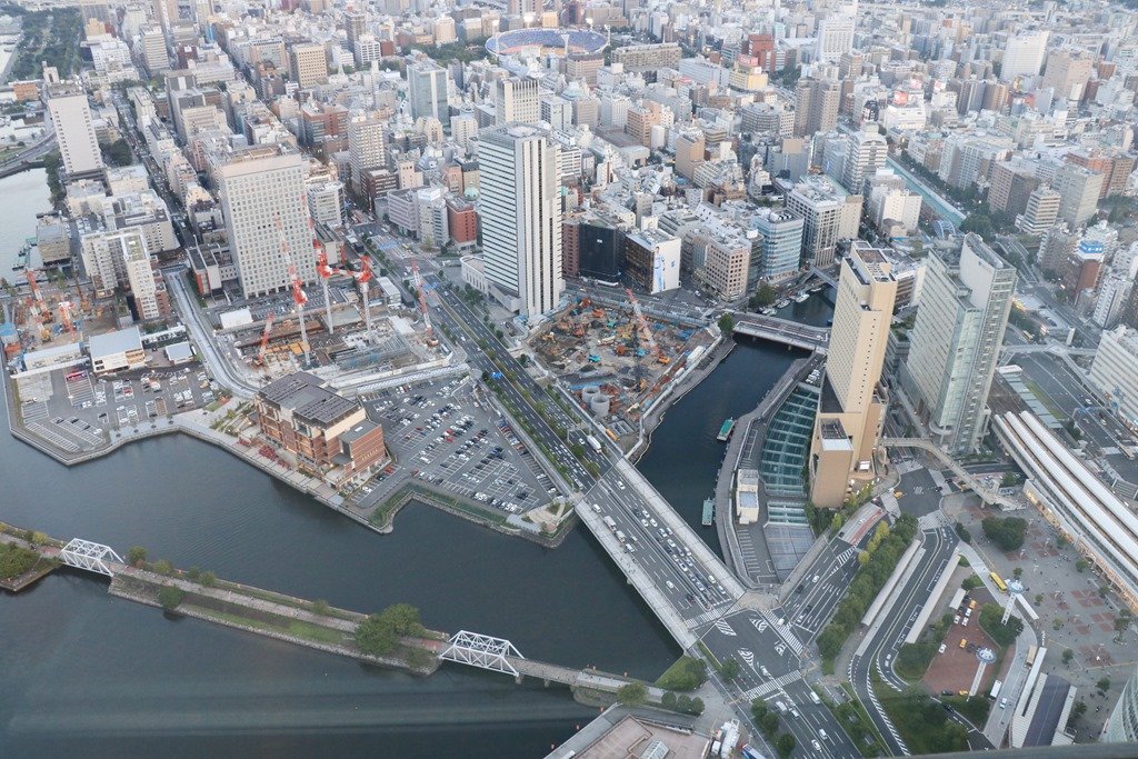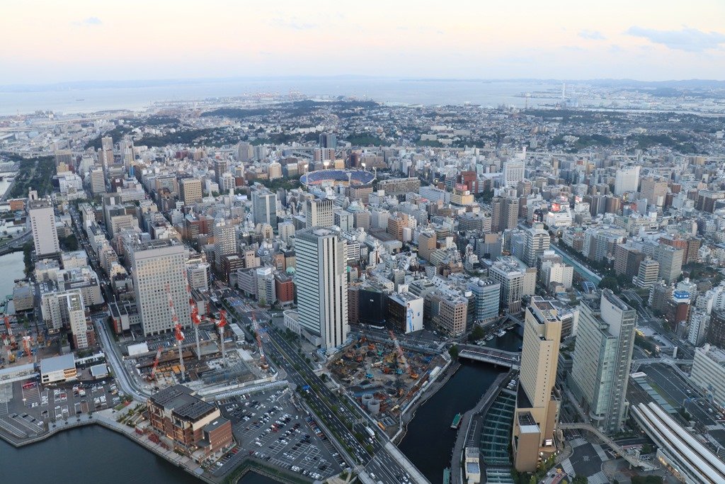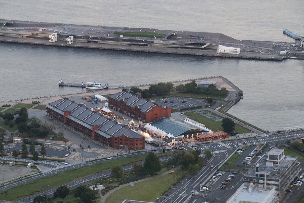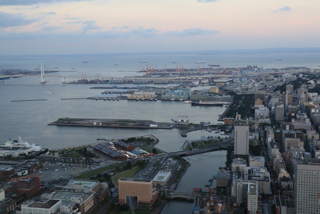 一番奥は本牧ふ頭でクレーン群が見えています。横浜ベイブリッジ、大桟橋、赤レンガ倉庫も見えます。写真を拡大して見て下さい。