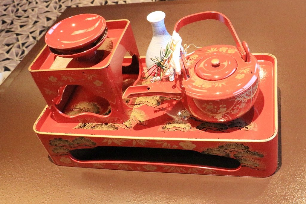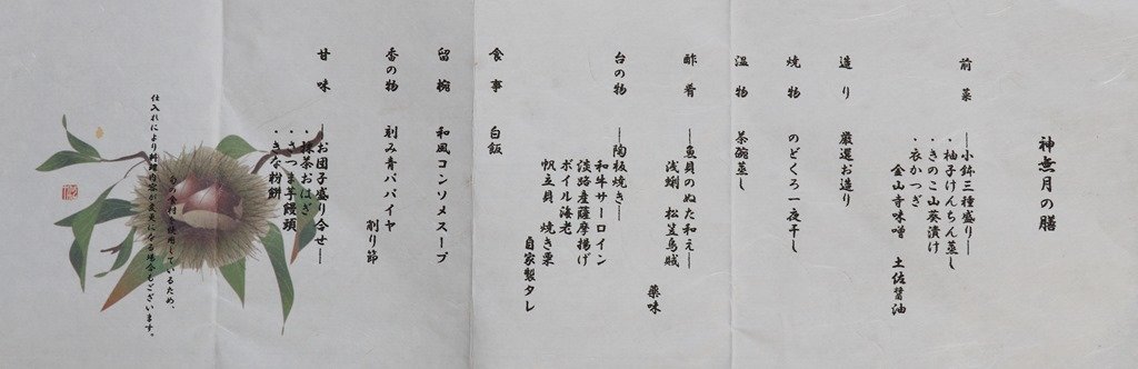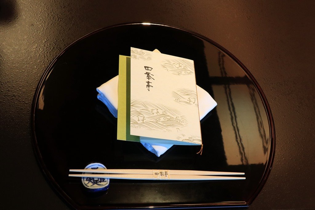 漆塗りの半月盆に四季亭と書かれた献立冊子とナフキンが乗っています。