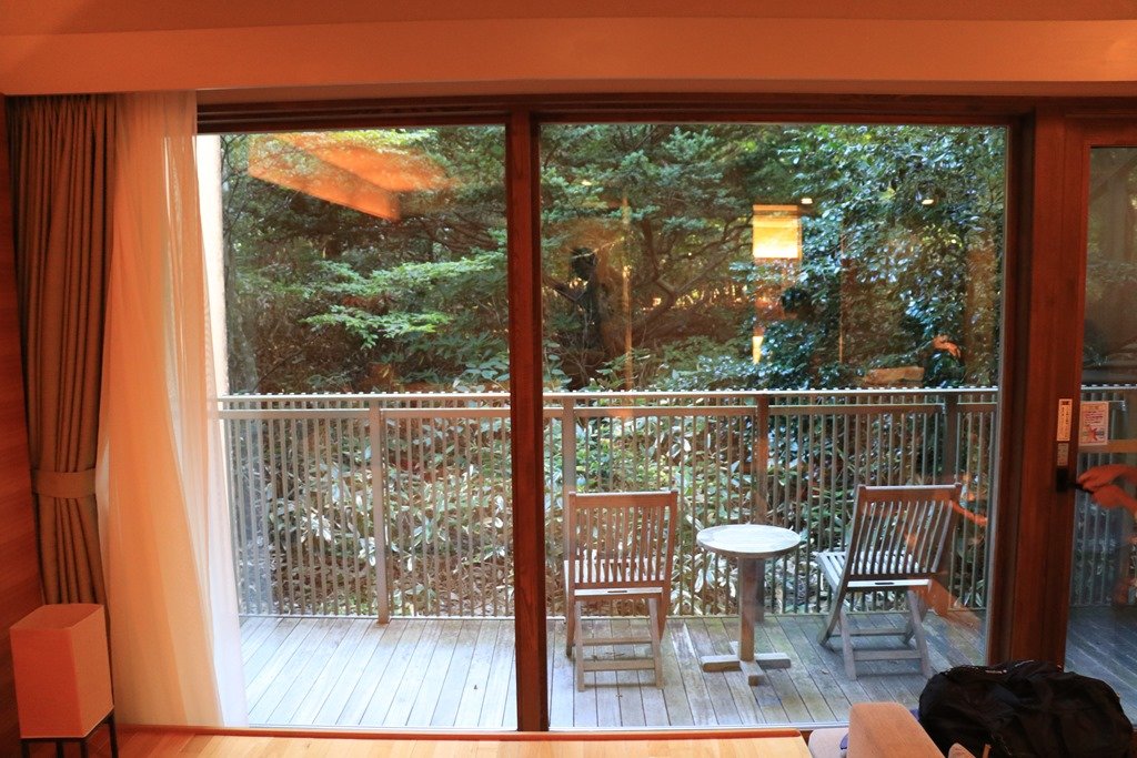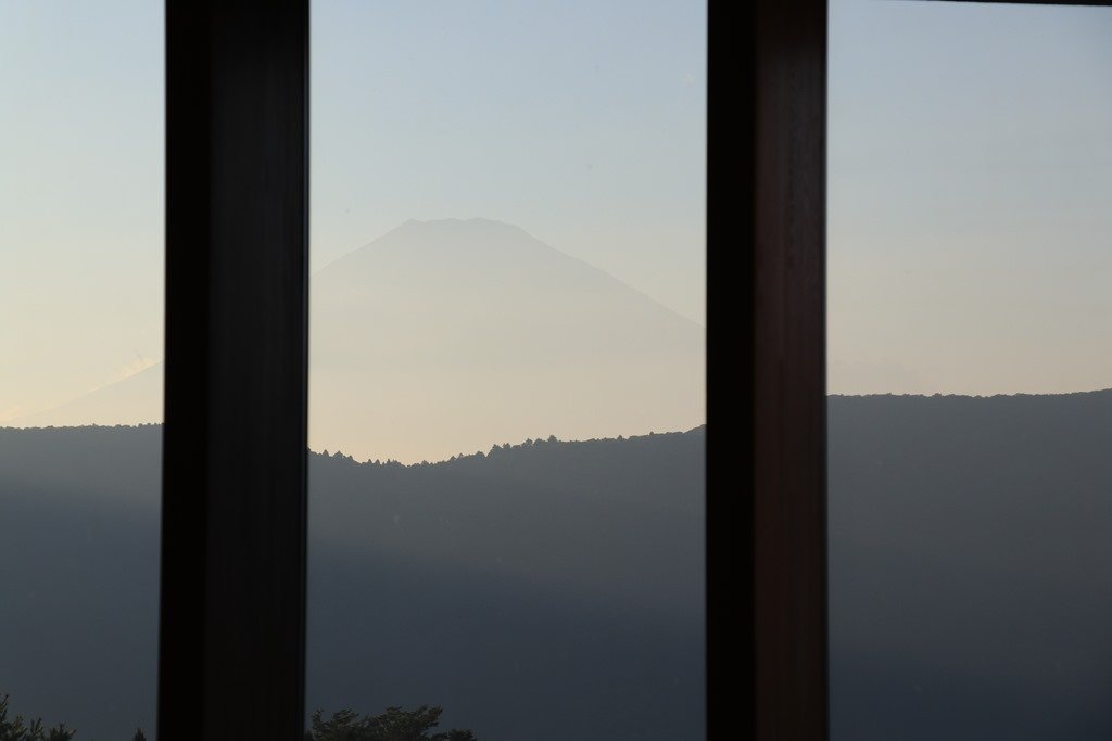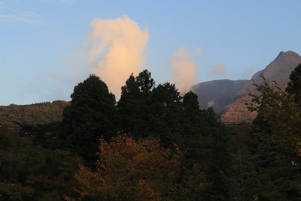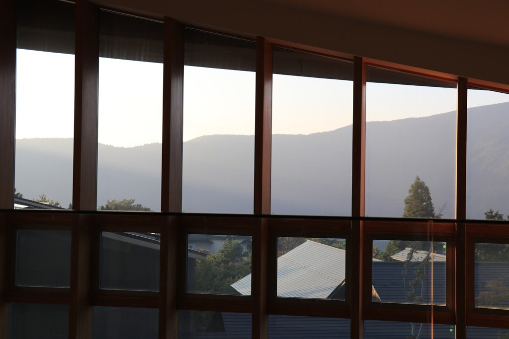 部屋への廊下を歩いている時、大涌谷で蒸気を吹きあげる様子が見えました。