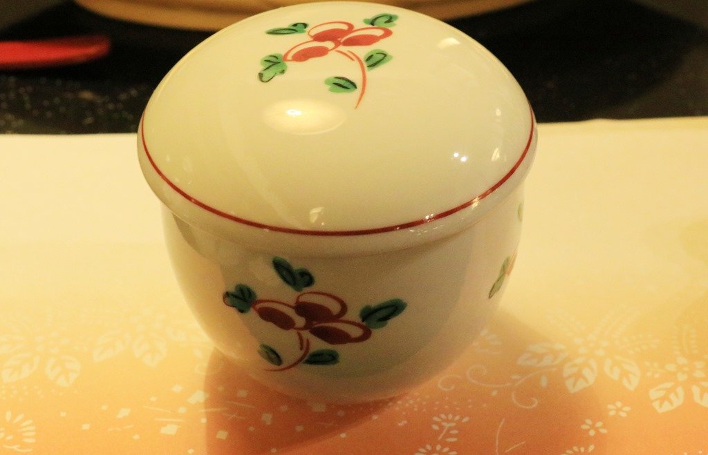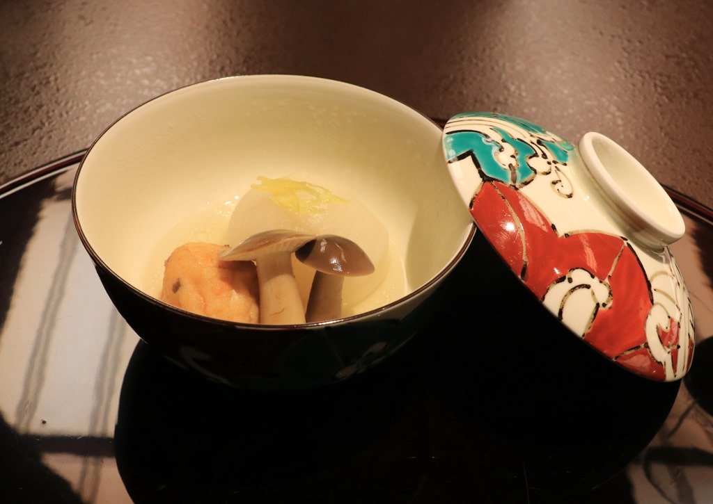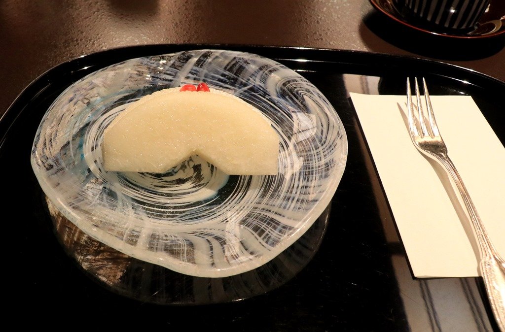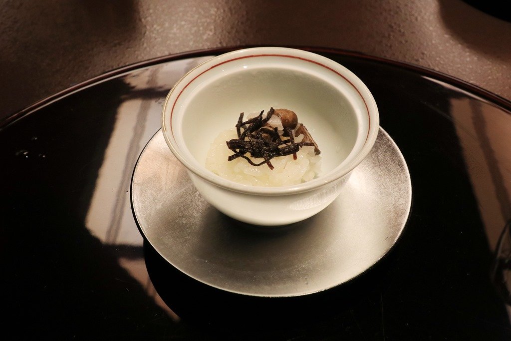 銀の皿に乗った純白の小さな器は凌ぎ(しのぎ)です。