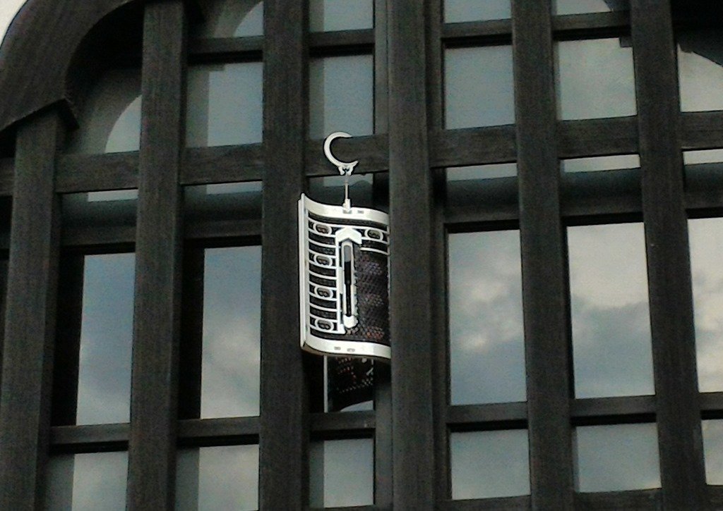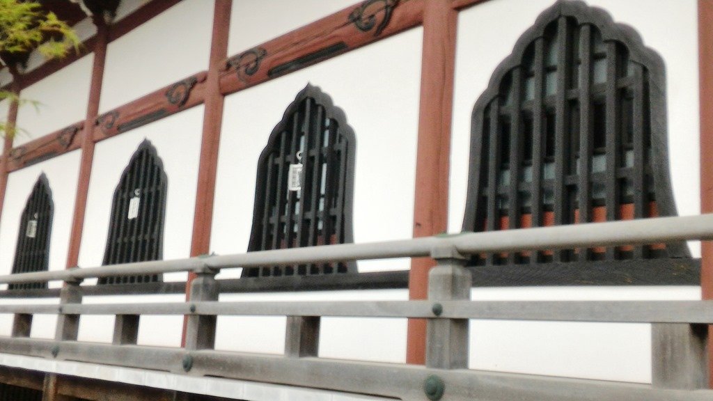 釣り鐘の形をした窓(花頭窓、火灯窓)に何かぶら下がっており気になりました。