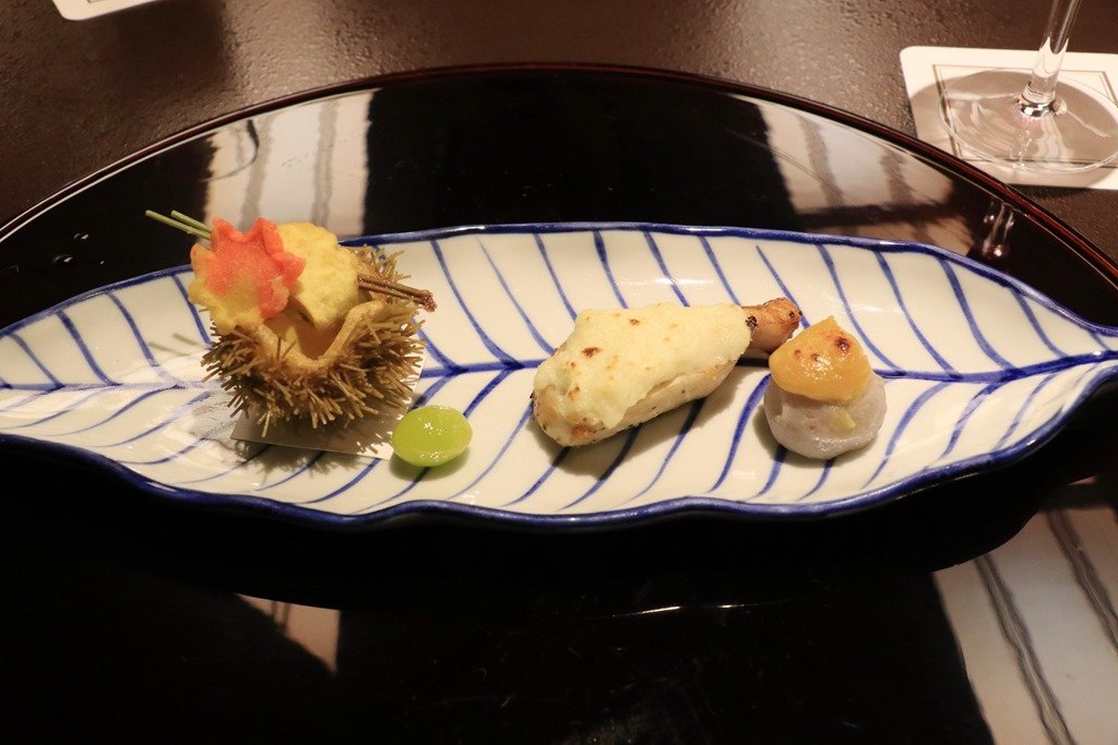 右から小芋田楽、鰆胡椒焼にホワイトソースが乗っています。