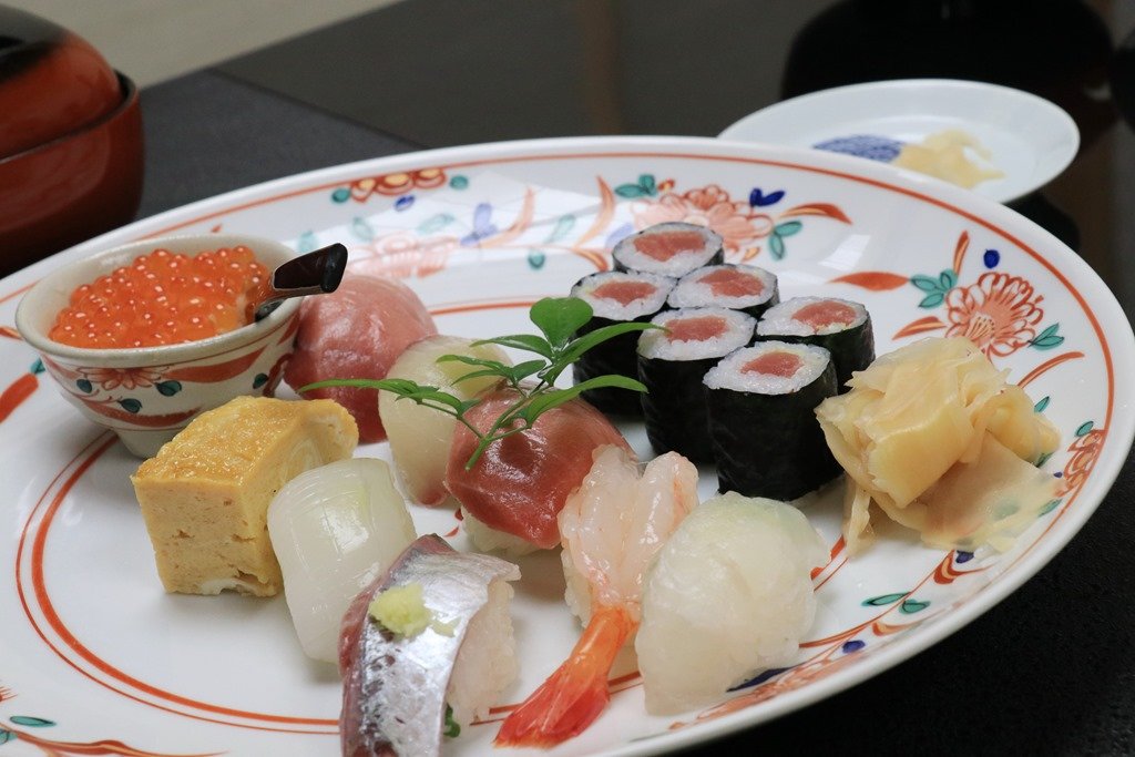 小鯛、胡瓜、大根、人参、山葵(わさび)、手前に長野パープル(ぶどう)、柿