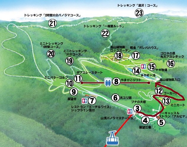 湯沢高原全体図です。まず、あやめヶ池を目指して下って行きました。