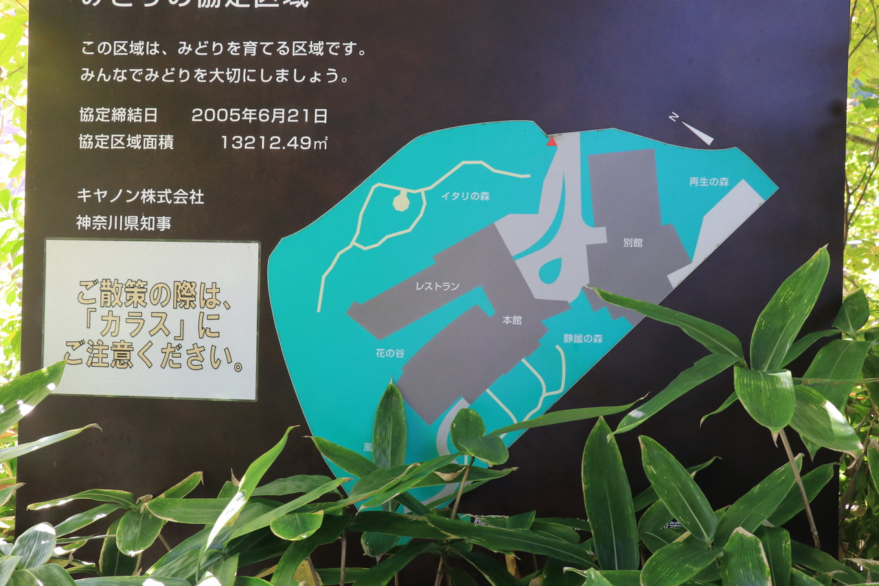 入口に散策路の説明板が立っており、緑を育てる地区としてキャノンと神奈川県知事が協定を結んでいると記してありました。地図に「イタリの森」と書いてあり不思議に思い、調べると外輪山の尾根に『至る』からついた名前で通称だそうです。