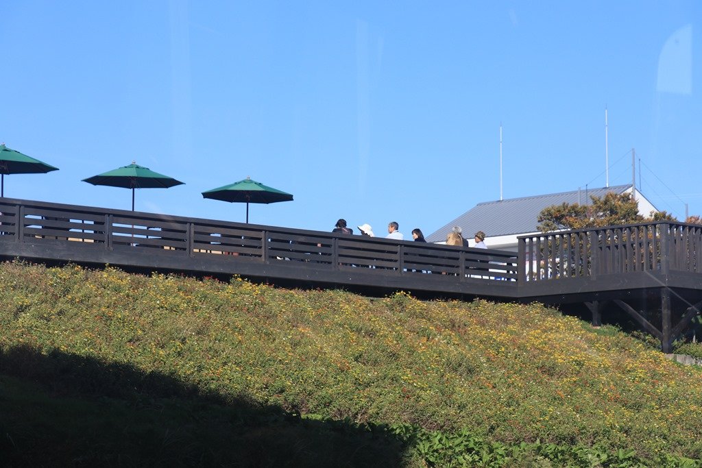 山頂駅に右に展望テラスがあり、前の斜面には小さな花の花畑になっていました。