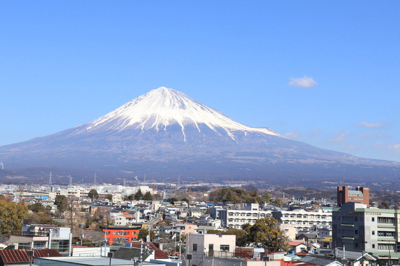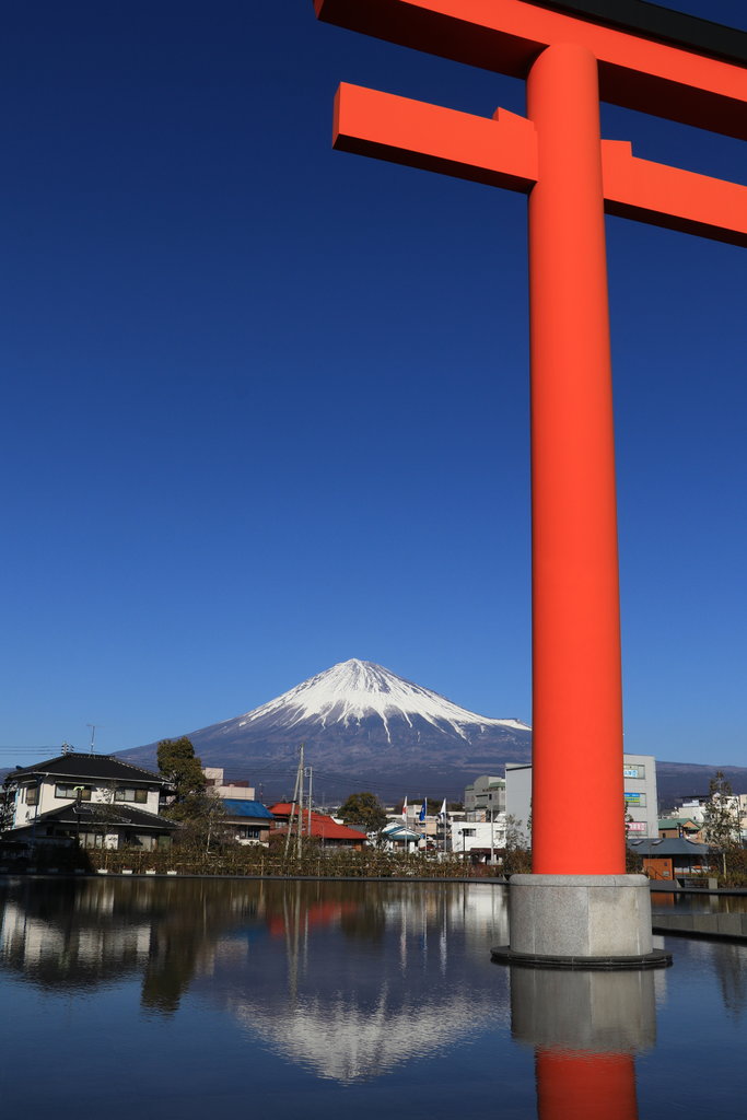 鳥居の中に雲一つない富士の勇姿を眺めることが出来ます。