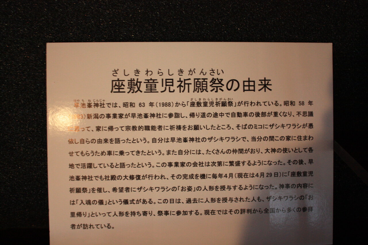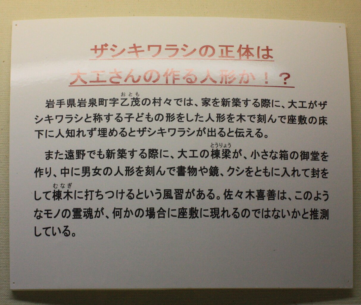 座敷わらしはオカッパ頭の子供の姿をした神様、または妖怪です。座敷ワラシ、座敷ボッコ、蔵ワラシ、御蔵ワラシなどさまざまな呼び名があり、これが住みついた家は栄えるが、いなくなると没落してしまうと言われています。夜、眠っている人の枕や布団に悪戯したりすることもあるらしいです。