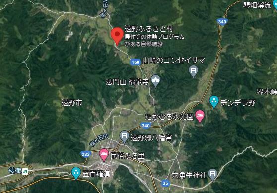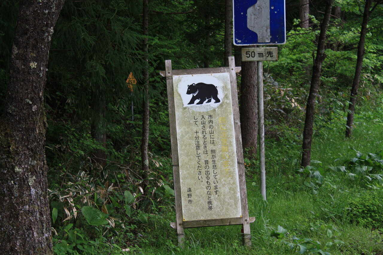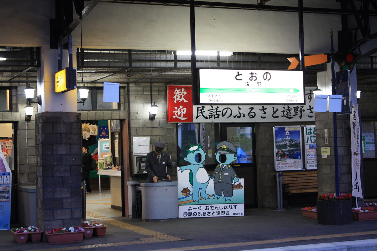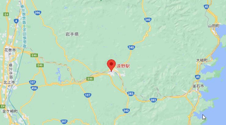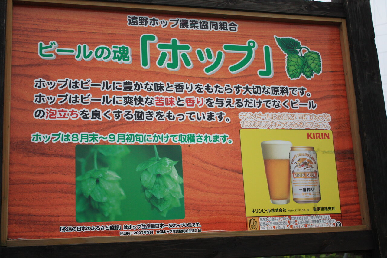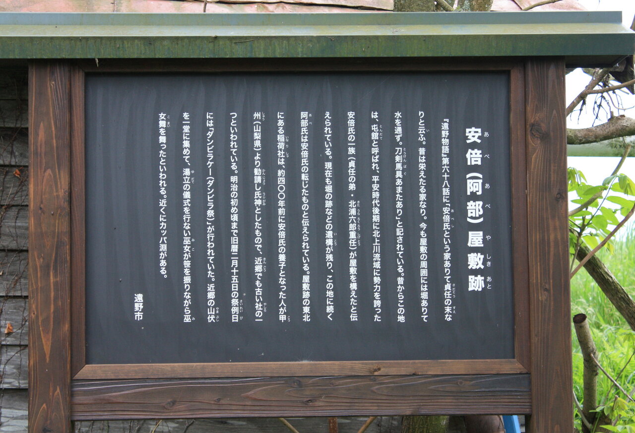 遠野は四方を山に囲まれた盆地です。遠野の街は昔、湖だった所に出来たと伝えられています。正面向こうの一番高い山が早池峰山(はやちねさん)(1917m)、右に六角牛山(ろっこうしさん)( 1294m )、左に石上山(いしがみさん)( 1038m )と1000m級の山が連なっています。これらは遠野三山と呼ばれています。
