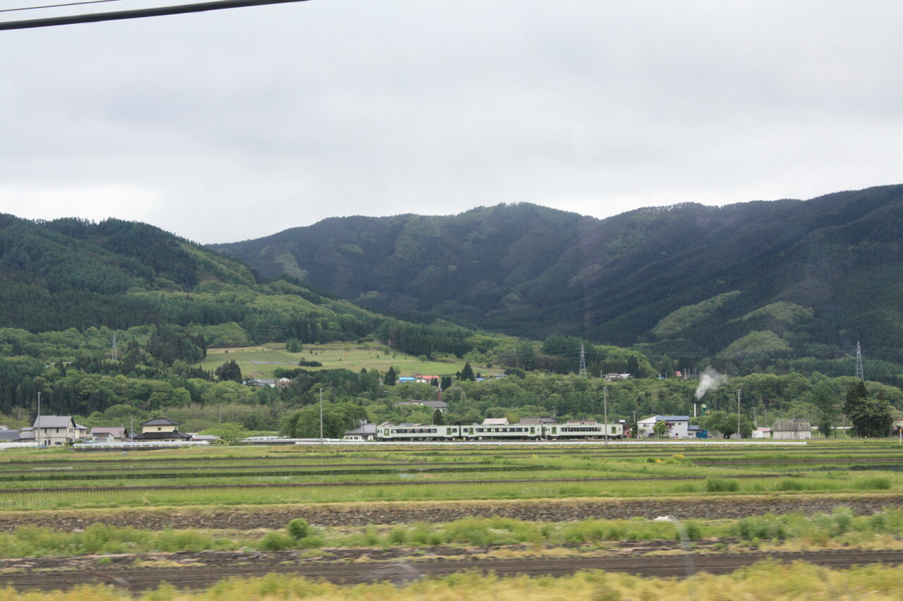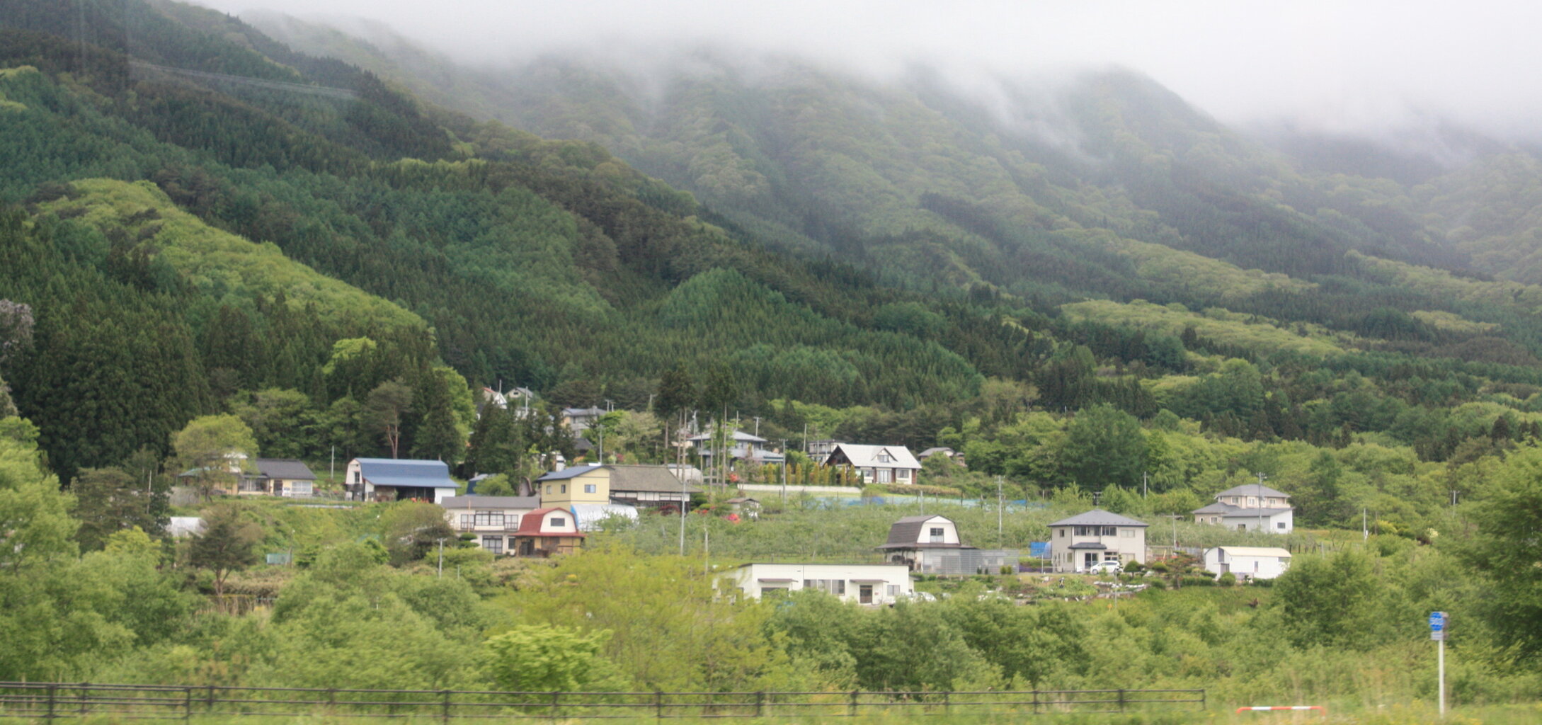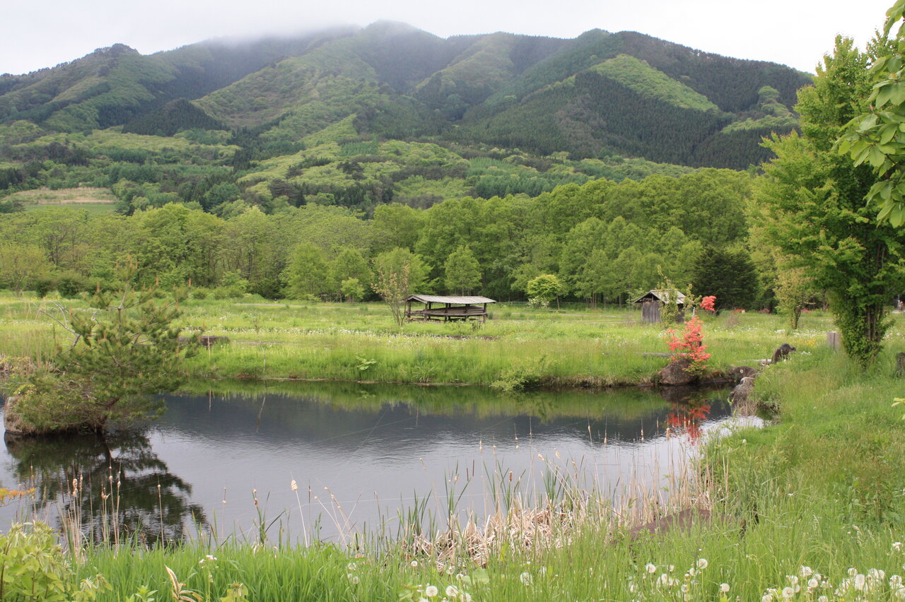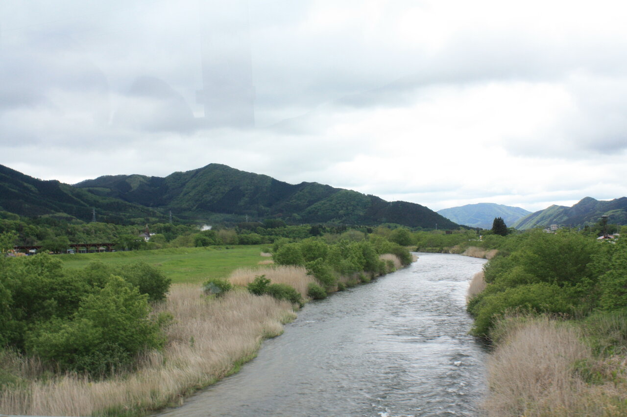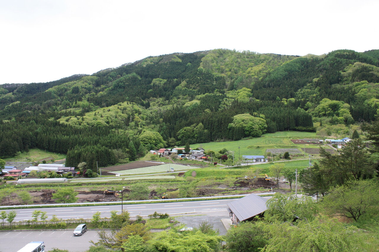 遠野は四方を山に囲まれた盆地です。遠野の街は昔、湖だった所に出来たと伝えられています。正面向こうの一番高い山が早池峰山(はやちねさん)(1917m)、右に六角牛山(ろっこうしさん)( 1294m )、左に石上山(いしがみさん)( 1038m )と1000m級の山が連なっています。これらは遠野三山と呼ばれています。