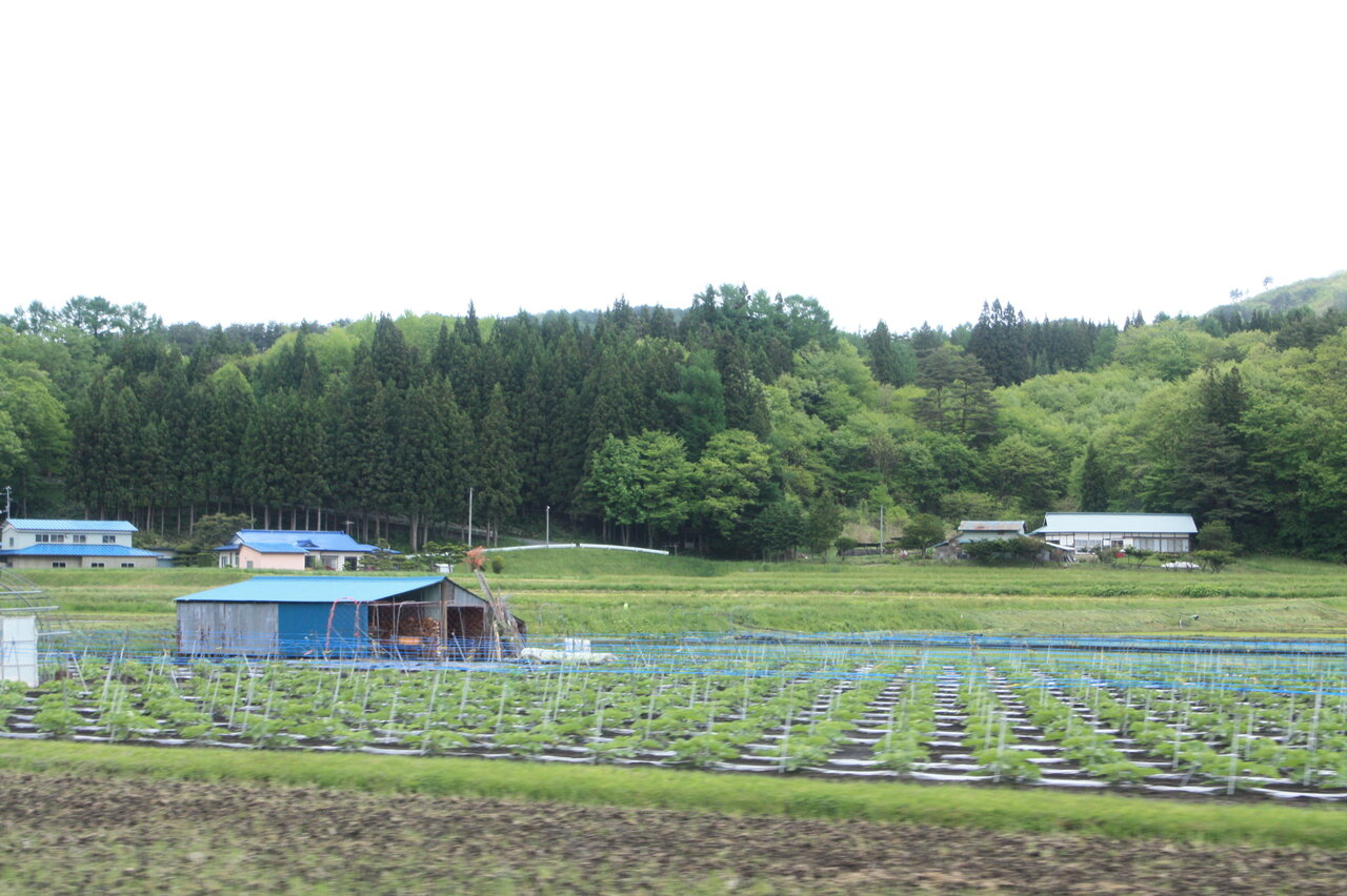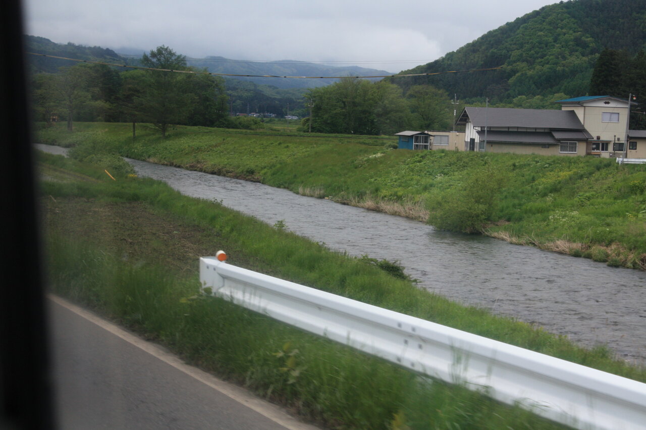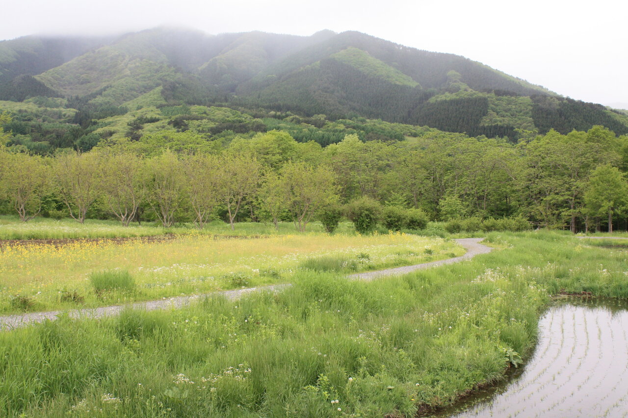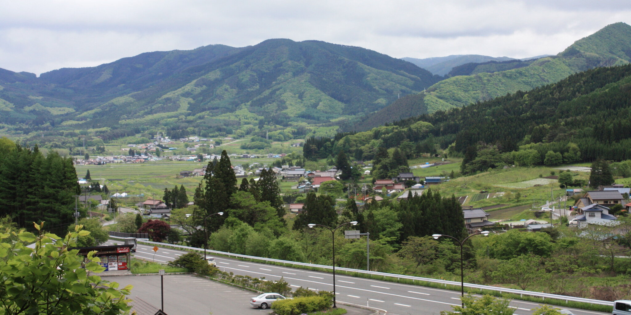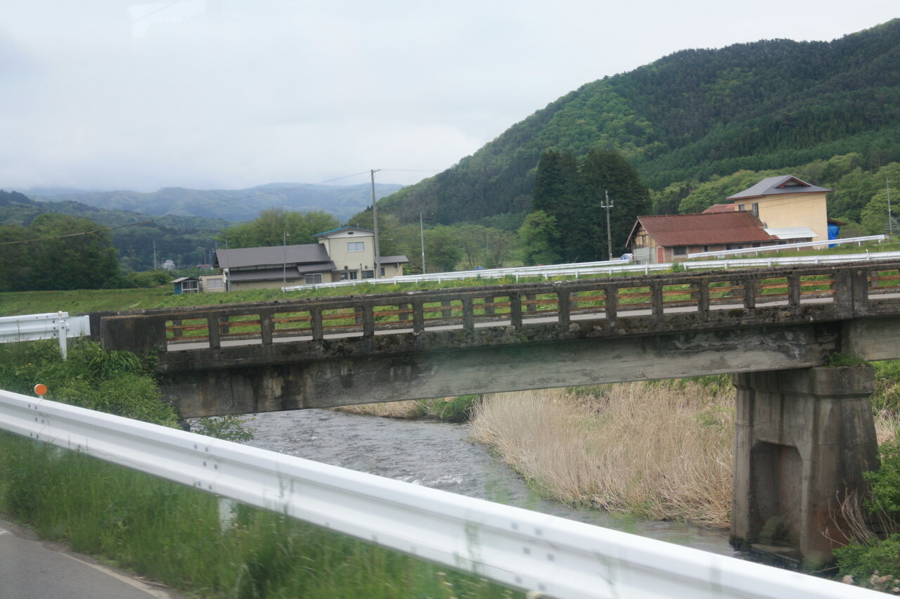 遠野は四方を山に囲まれた盆地です。遠野の街は昔、湖だった所に出来たと伝えられています。正面向こうの一番高い山が早池峰山(はやちねさん)(1917m)、右に六角牛山(ろっこうしさん)( 1294m )、左に石上山(いしがみさん)( 1038m )と1000m級の山が連なっています。これらは遠野三山と呼ばれています。