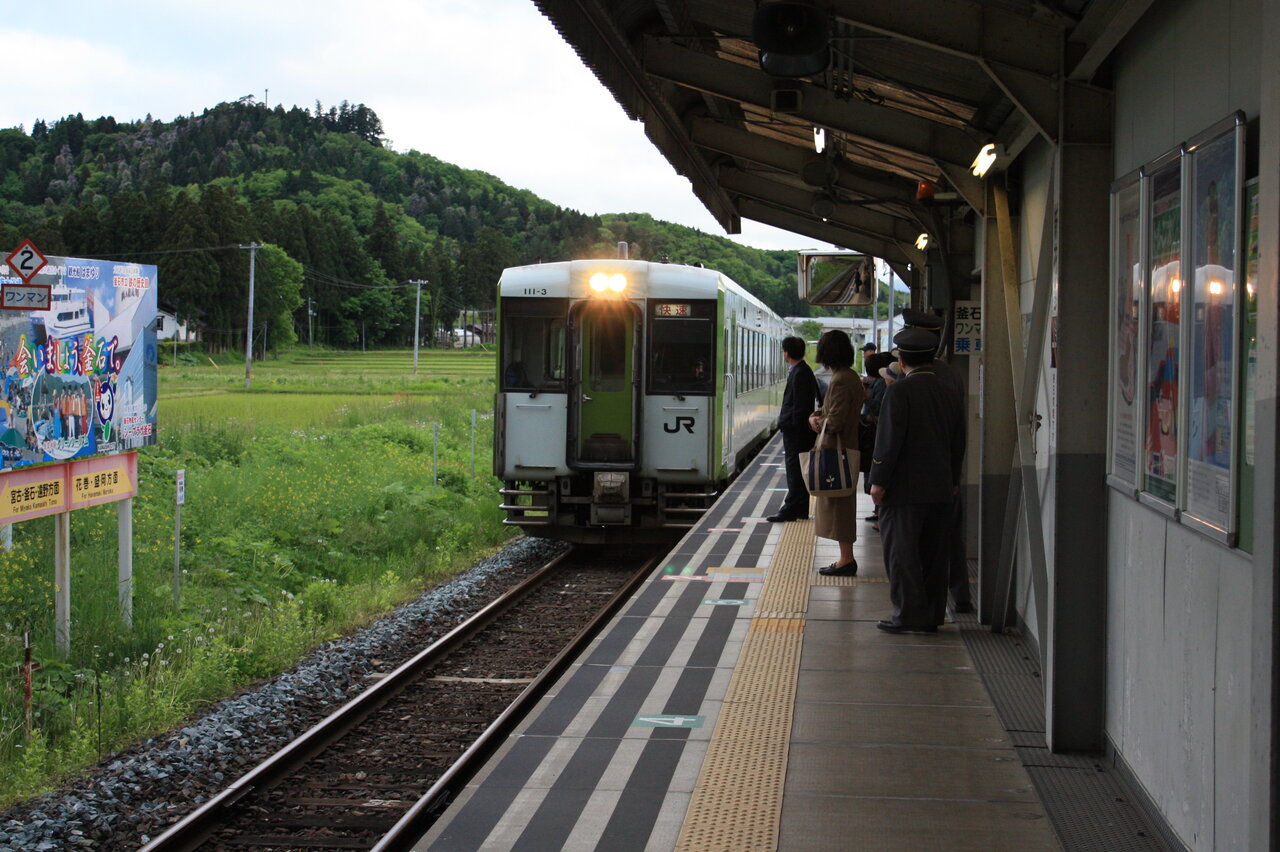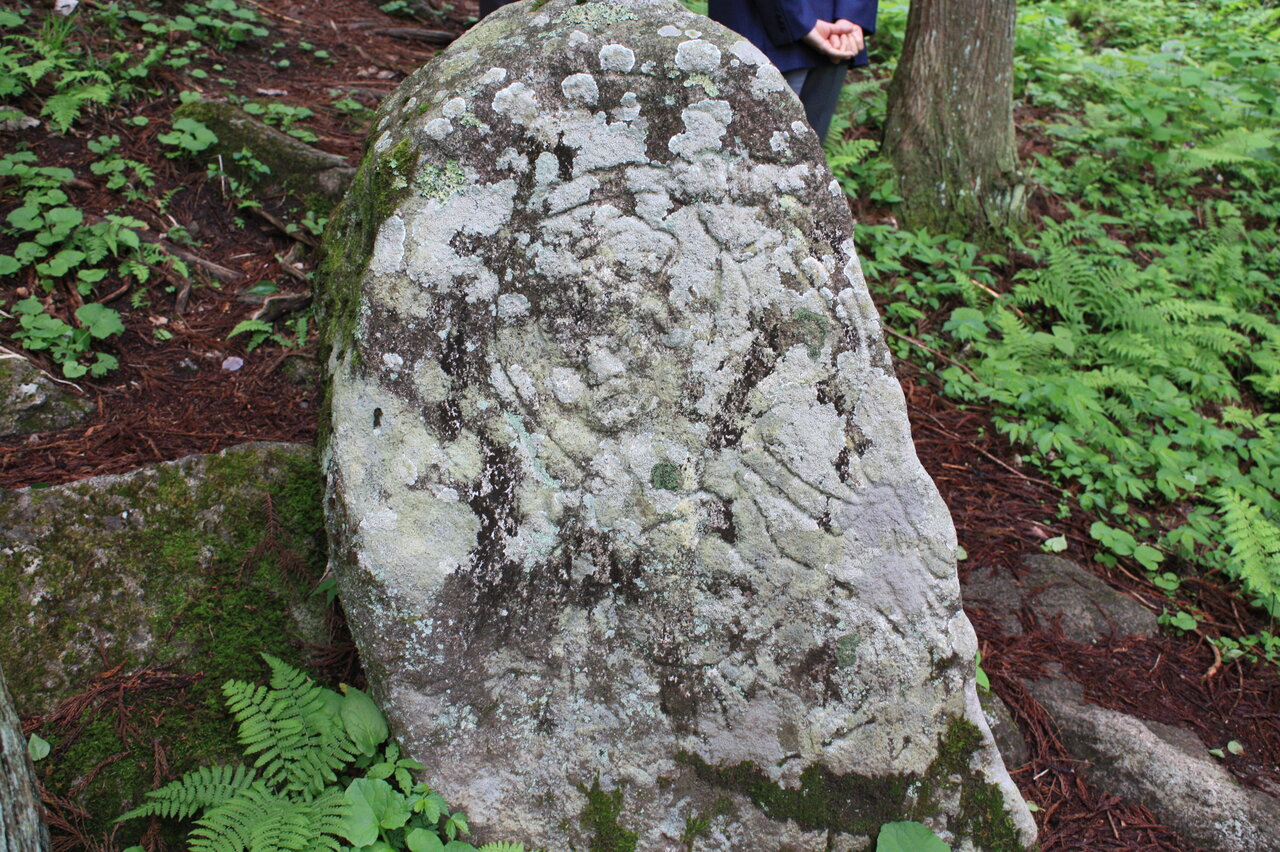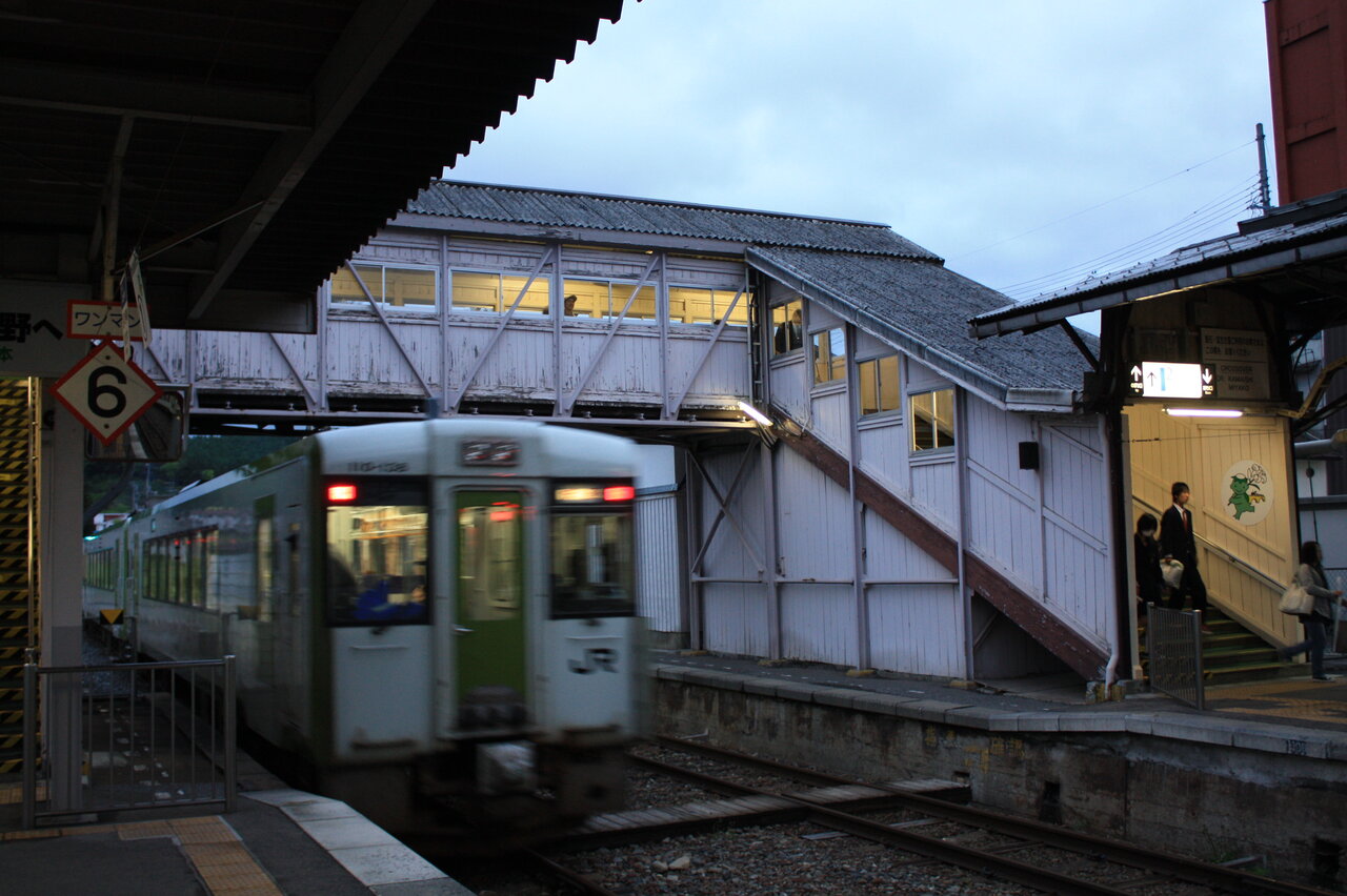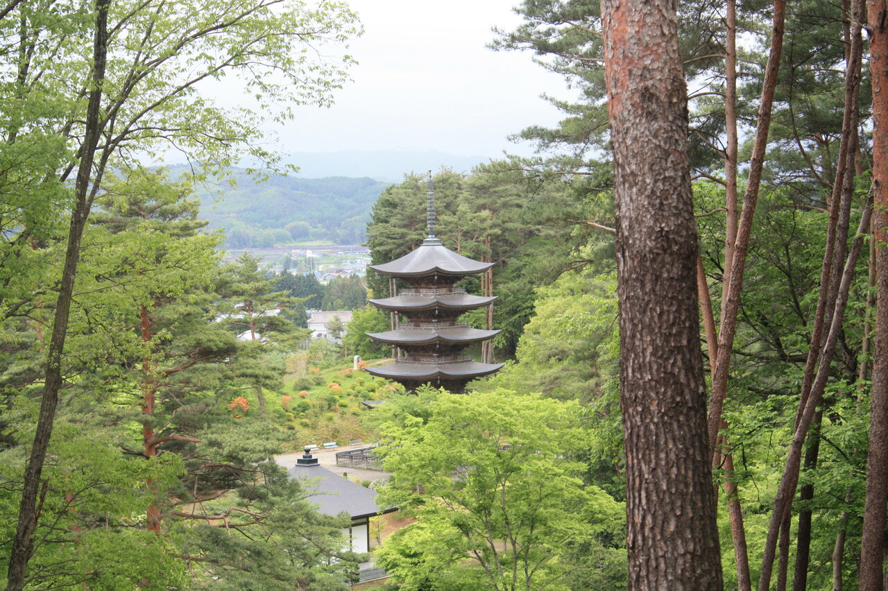 遠野は四方を山に囲まれた盆地です。遠野の街は昔、湖だった所に出来たと伝えられています。正面向こうの一番高い山が早池峰山(はやちねさん)(1917m)、右に六角牛山(ろっこうしさん)( 1294m )、左に石上山(いしがみさん)( 1038m )と1000m級の山が連なっています。これらは遠野三山と呼ばれています。