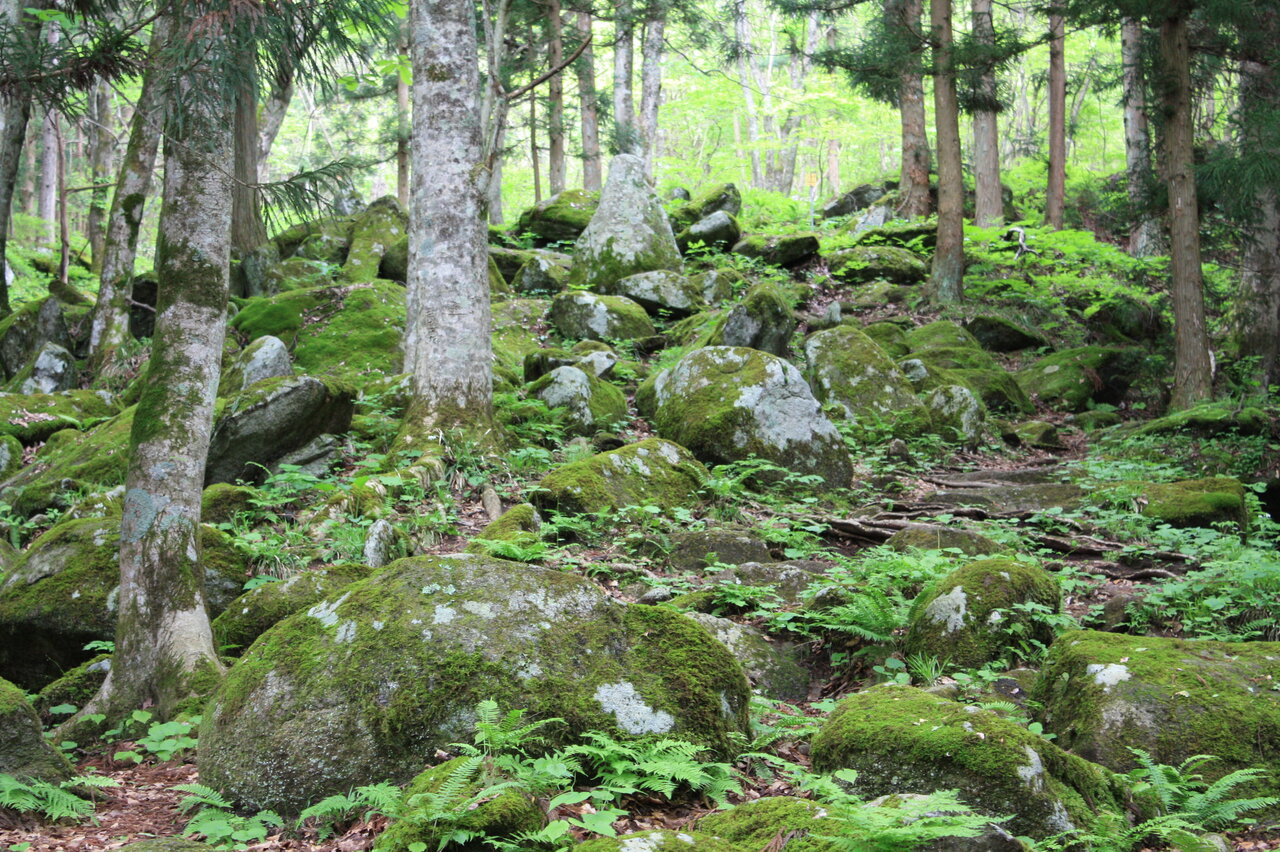 大昔、女神がいました。三人の娘を連れて高原にさしかかり、来内(らいない)村の伊豆権現(いずごんげん)社(やしろ)のあたりに泊まりました。母の女神は「今夜よき夢を見た娘に、最もよい山をあげよう」と三人の女神たちに語って休みました。夜が更けて、天より霊華(れいか)が降りて、姉の女神の胸の上に止りました。末の女神(二女の女神との説もある) がその華(はな)に気づき、こっそり取り上げ、自分の胸の上にのせて休みましので、最も美しい早池峰山をもらうことになりました。姉たちは六角牛(ろっこうし)山と石神(いしがみ)山をもらいました。若い三人の女神はそれぞれ三つの山に住み、今もこれを治めており、遠野の女たちは女神のやきもちを恐れ今でもこの山に登らないといわれています。