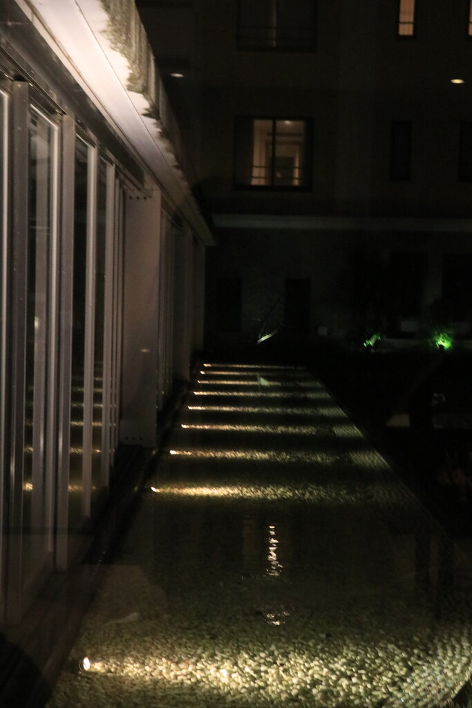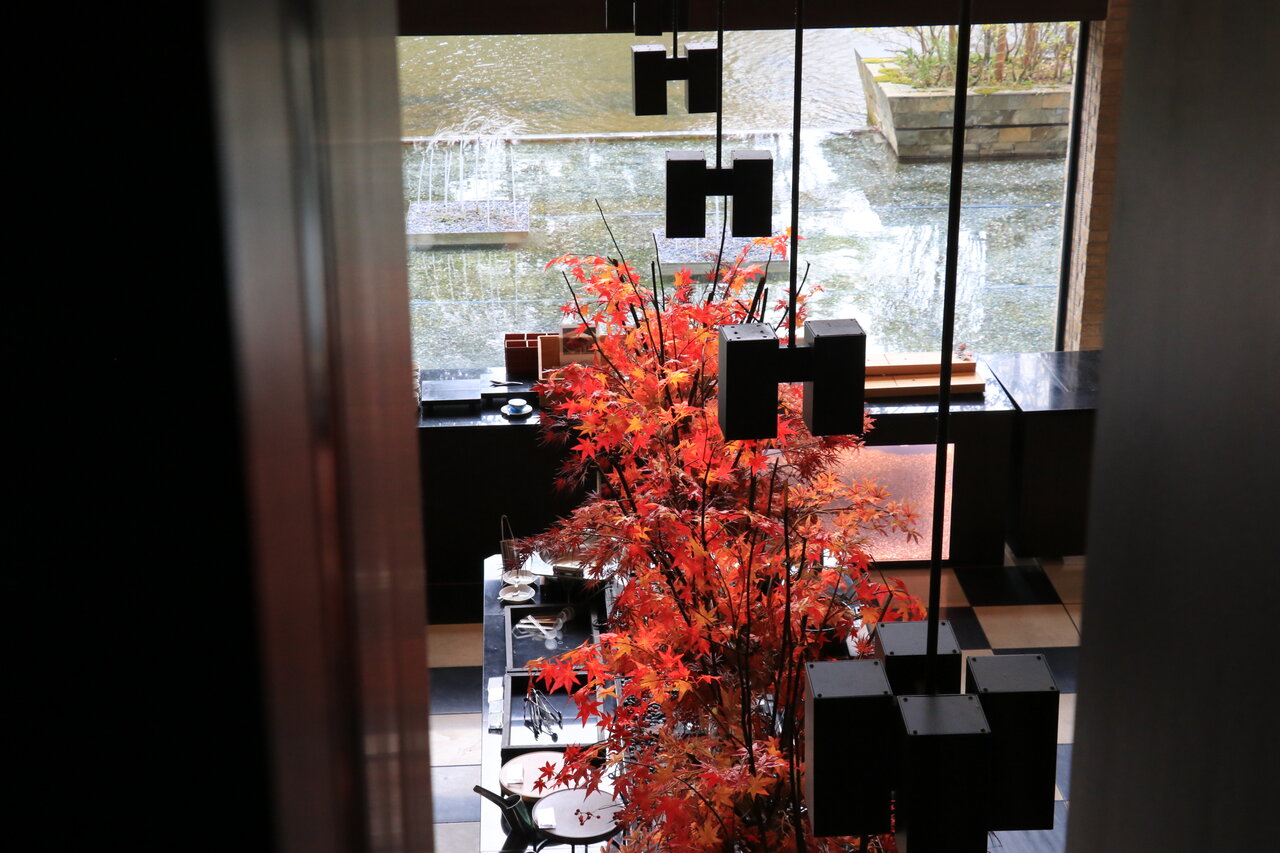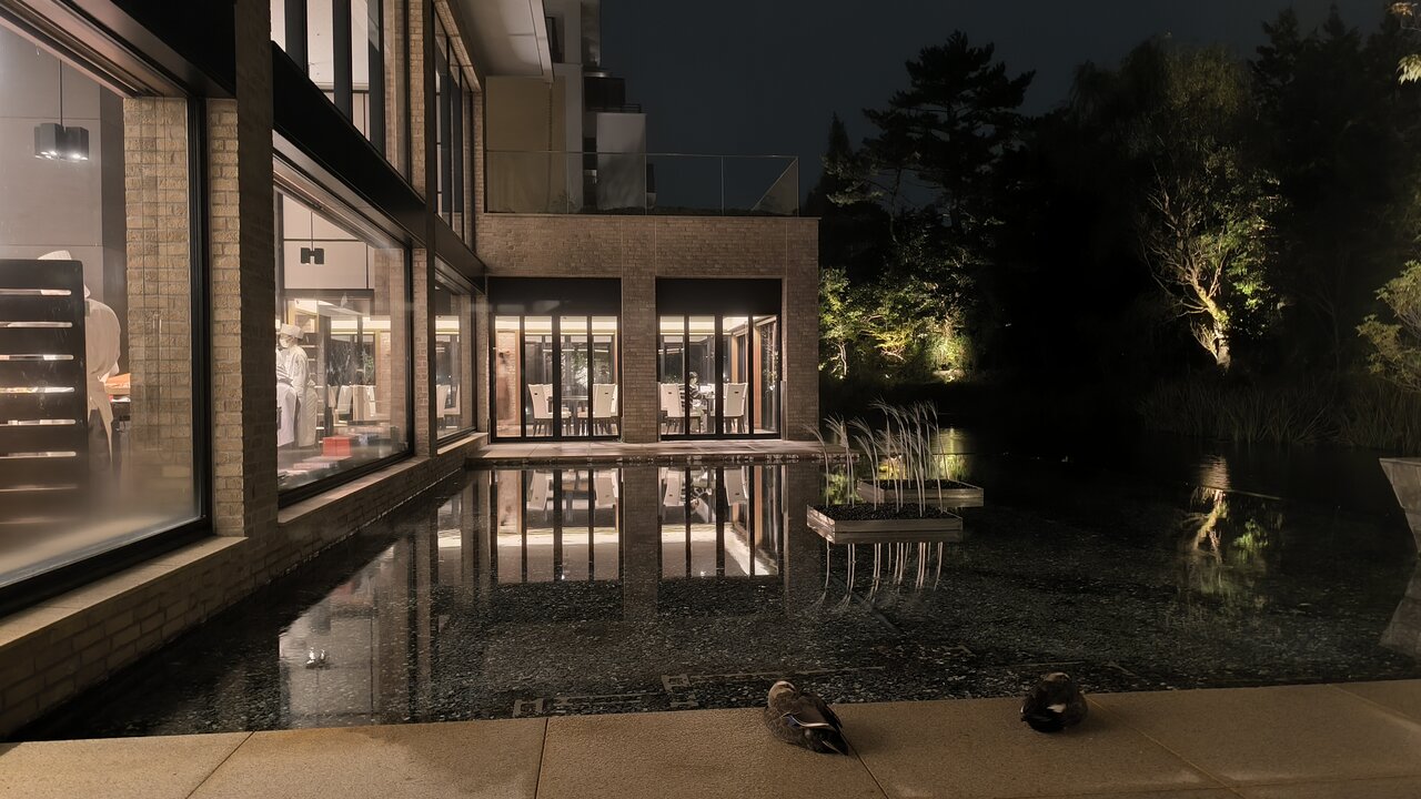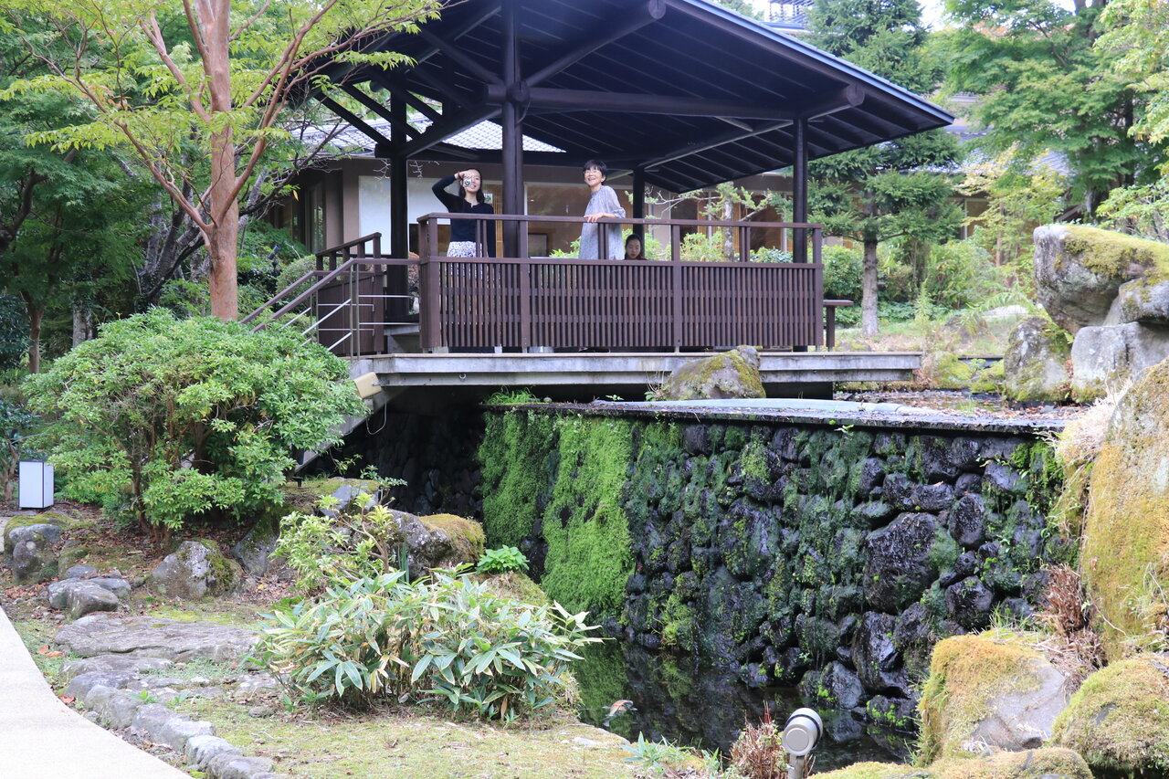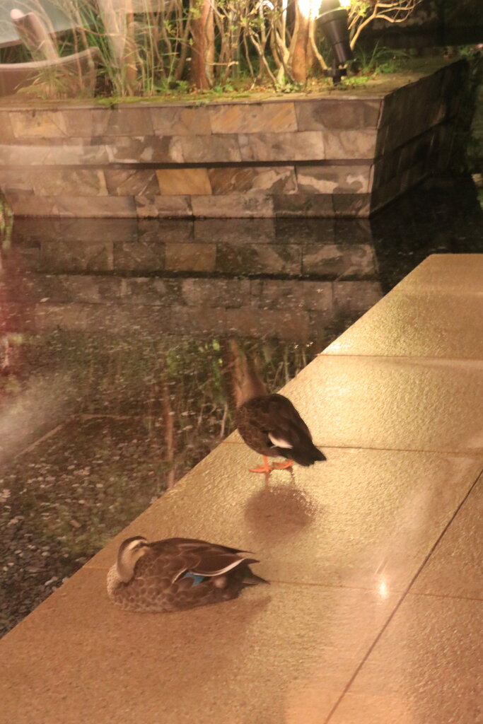 食事を終えた頃、池に対のカモが来て、潜っては餌を取るかわいい姿を見ることができました。カモはホテルで飼っているのではなく何処からか飛んでくるとのことでした。