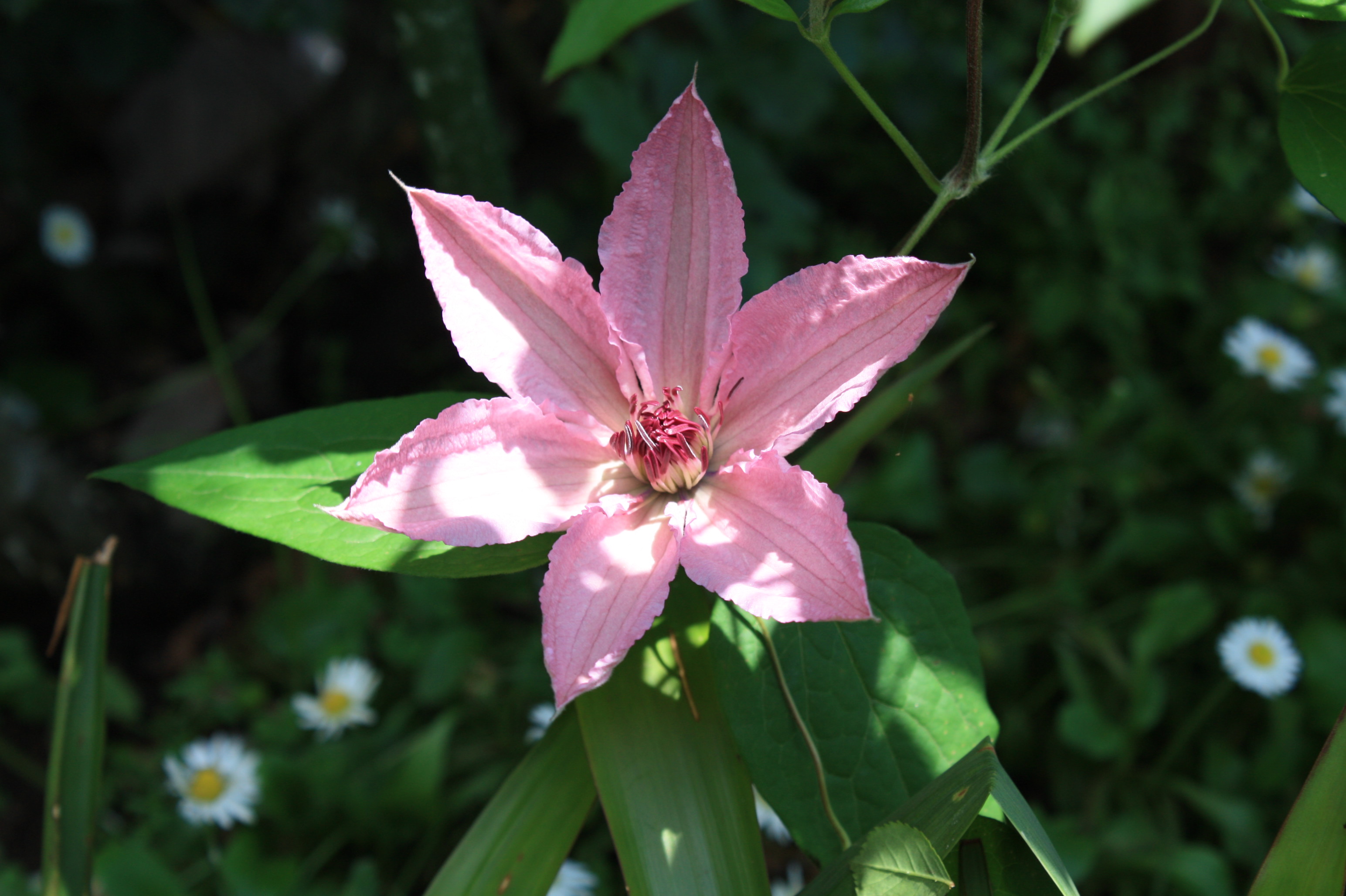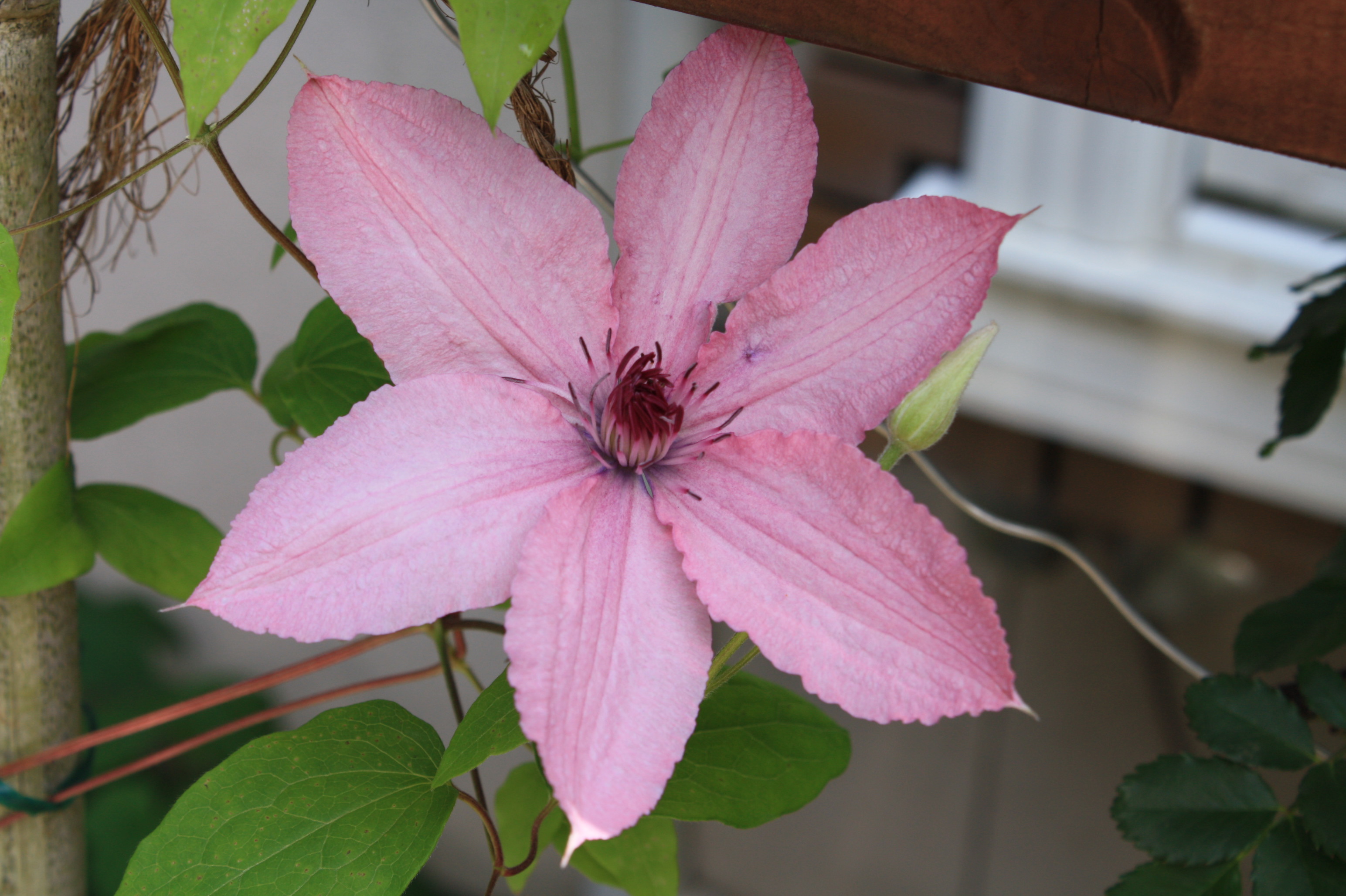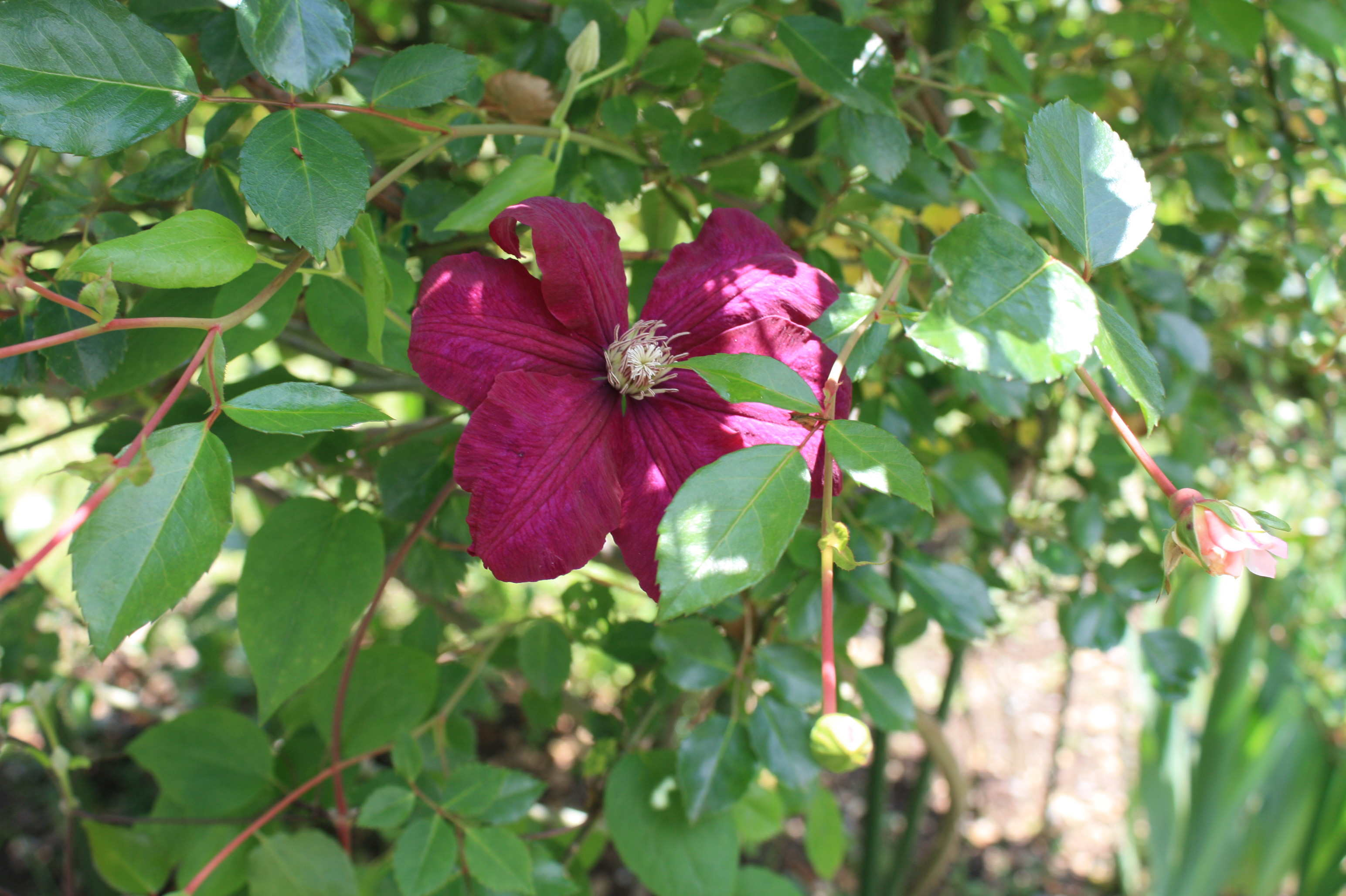 お気に入りのクレマチスです。薄い赤紫色のやさしいクレマチスです。日陰に植えるとややブルーがかってきます。エントランスのつる薔薇のそばのものです。挿し木でよく着きますので増やすことが簡単です。咲くのは少し遅く今頃となります。見ていると味が出てくる赤いビロードのようなクレマチス。ランブラーローズのそばに鉢を置き薔薇に絡ませました。残念ながら薔薇が咲くのが遅く、咲いているのはクレマチスだけになりました。