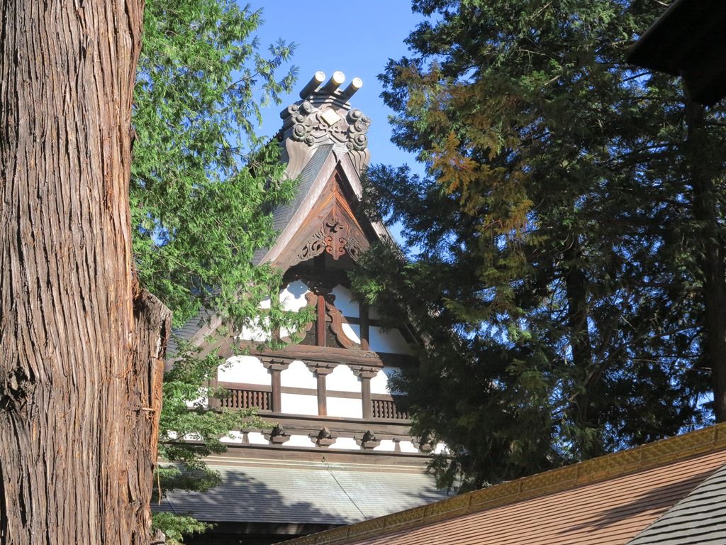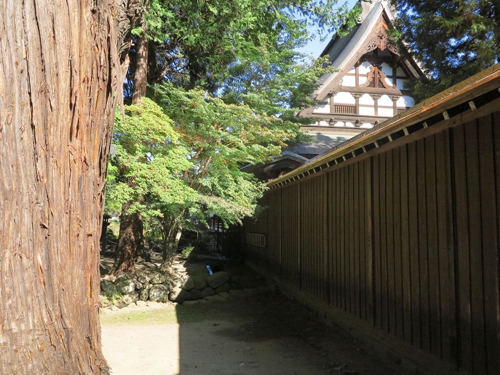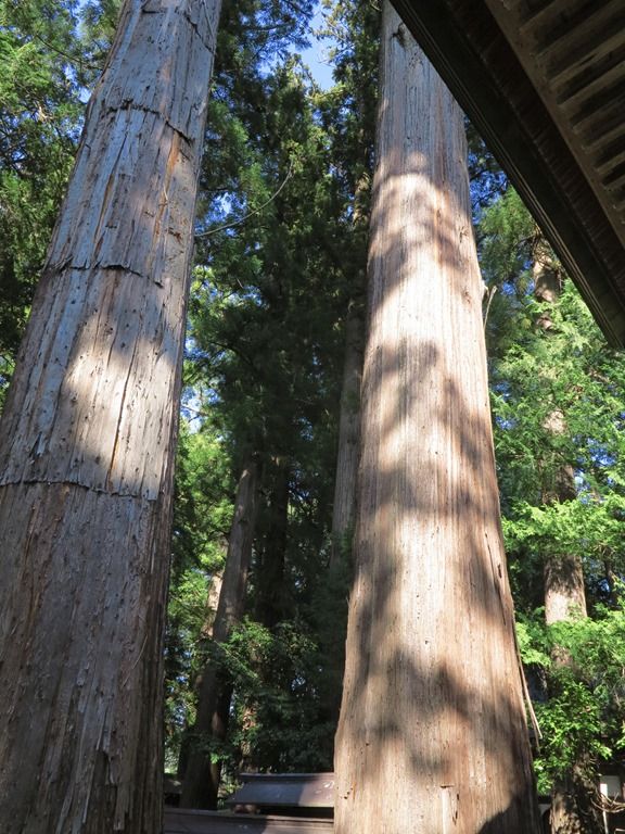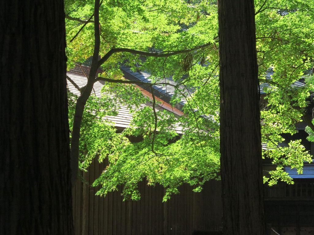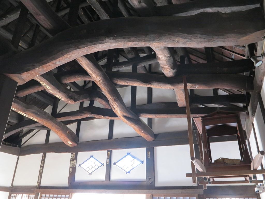 庫裡出入り口の複雑に絡めた自然木梁が大きな建物のねじれを防止しています。
