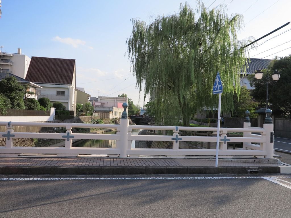柳の木が橋の袂に建つ興文橋。流れる川は水門川という大垣城外堀です。