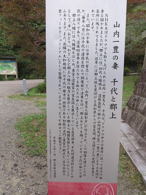 山内一豊夫人 千代は、司馬遼太郎の原作では近江の国出身になっていますが、近年では郡上出身説が有力になっているとのことで、ここに像がありました。像が表しているのは、一豊がいざ戦いに参加する段になり、栗毛の馬が欲しかったが貧乏で購入できずにいると、千代がへそくりを使い馬を購入して渡したという逸話です。千代は妻の鏡と称されました。