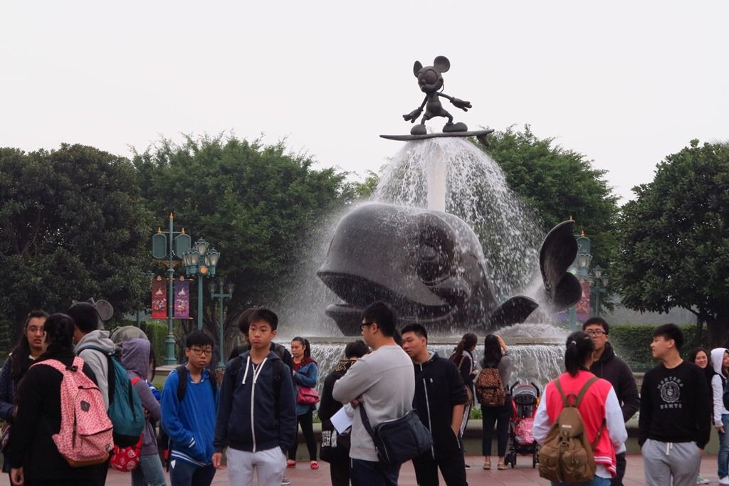 遠くに噴水が見え、近づいてみると鯨が潮を吹いている上でサーフィンをしているミッキーでした。