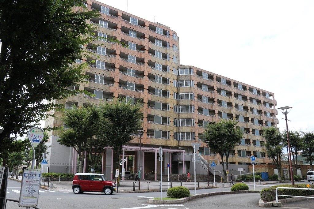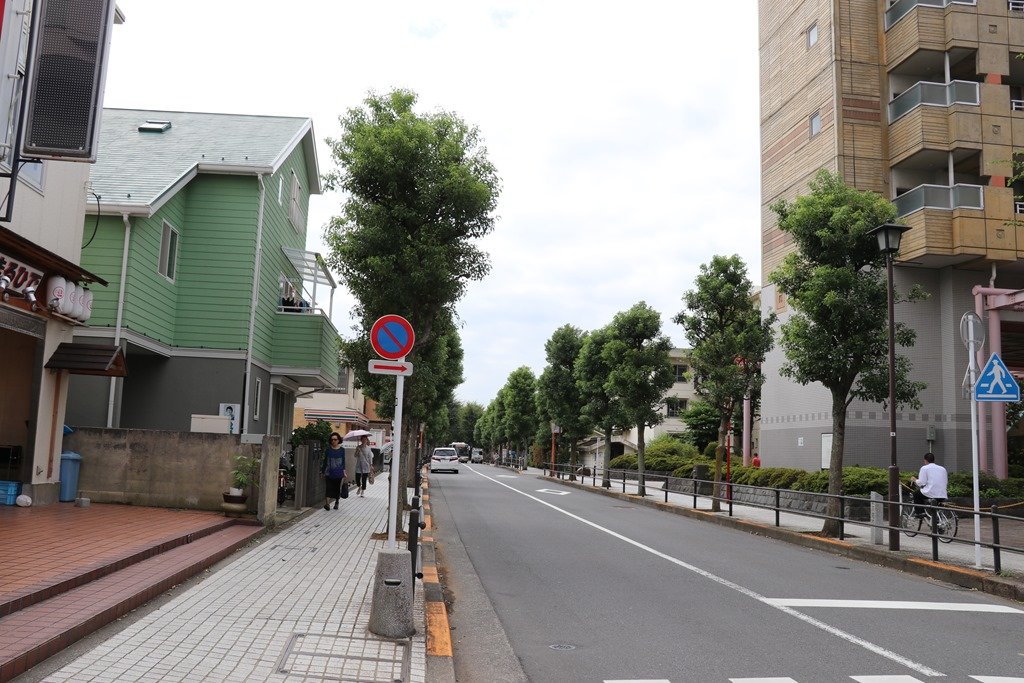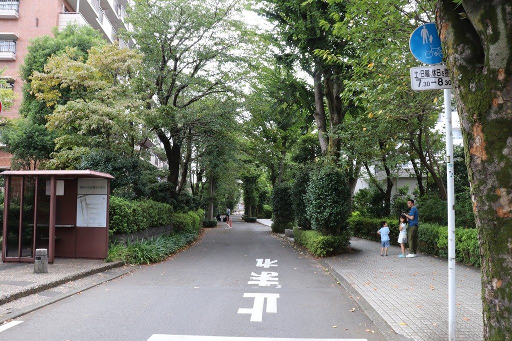 両サイドは並木でマンションと住宅が並ぶ静かな通りです。