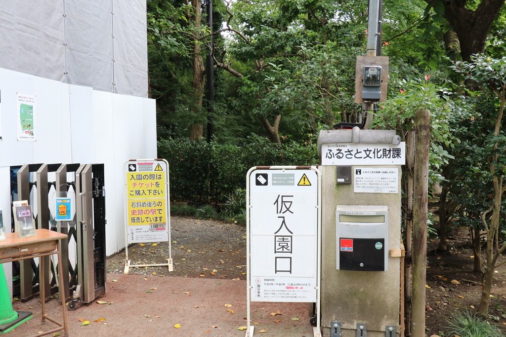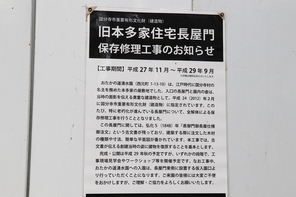 旧本多住宅長屋門は残念ながら工事中でした。中はお鷹の道湧水園とふるさと文化財および武蔵国分寺資料館となっています。