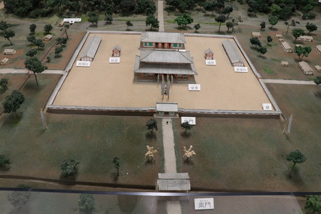 右下に七重塔があり、中央が金堂、その後ろに講堂があり、ずっと奥に楼門が見えます。