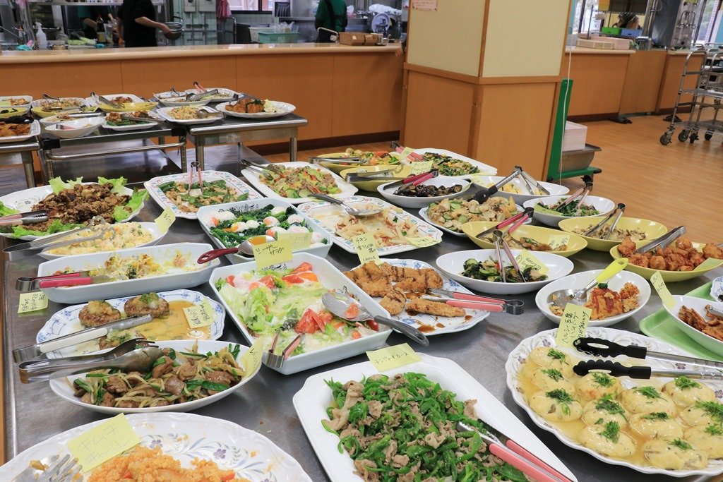 多くの品が皿に盛られて机の上に置かれ自由にとって最後に重さを測定し料金を払うシステムです。学生数が多くないのでこじんまりした感じです。
