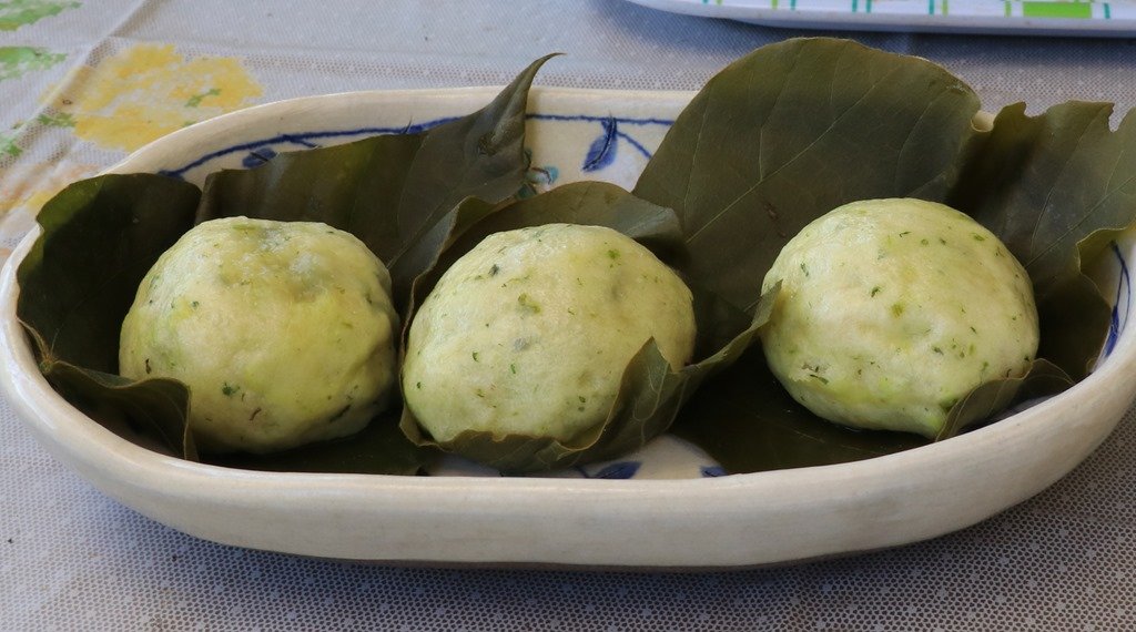 よもぎのまんじゅう。敷いてあるのは葛の葉。