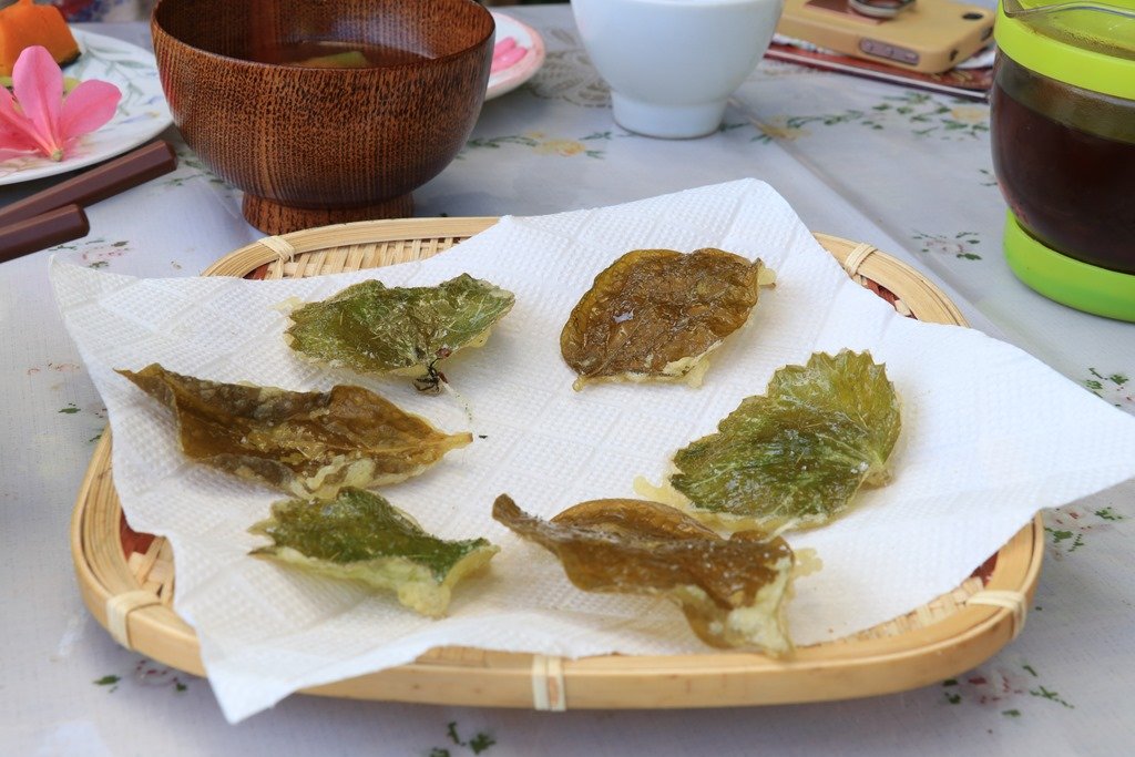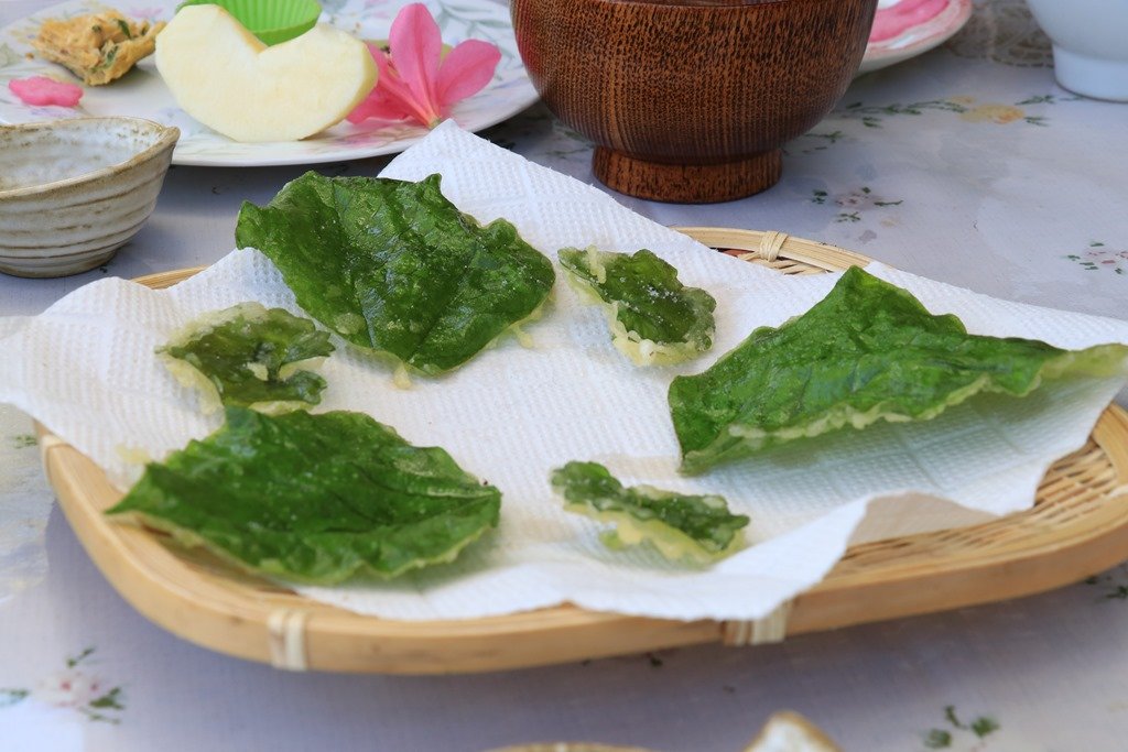 自然の山菜の天ぷら。葛の葉や普通は嫌う雑草も食べられるのです。