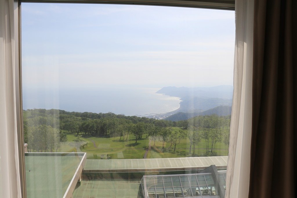 カーテンを開けると洞爺湖ではなくオーシャンビューの部屋でした。オーシャンビューの方が1000円安いとのことです。