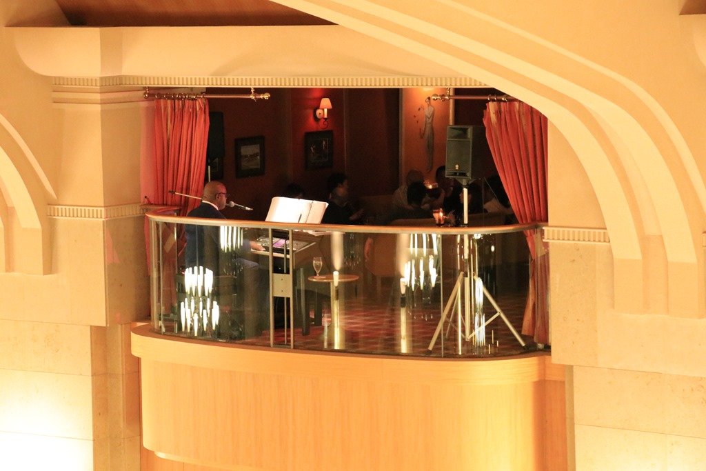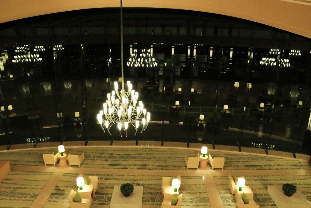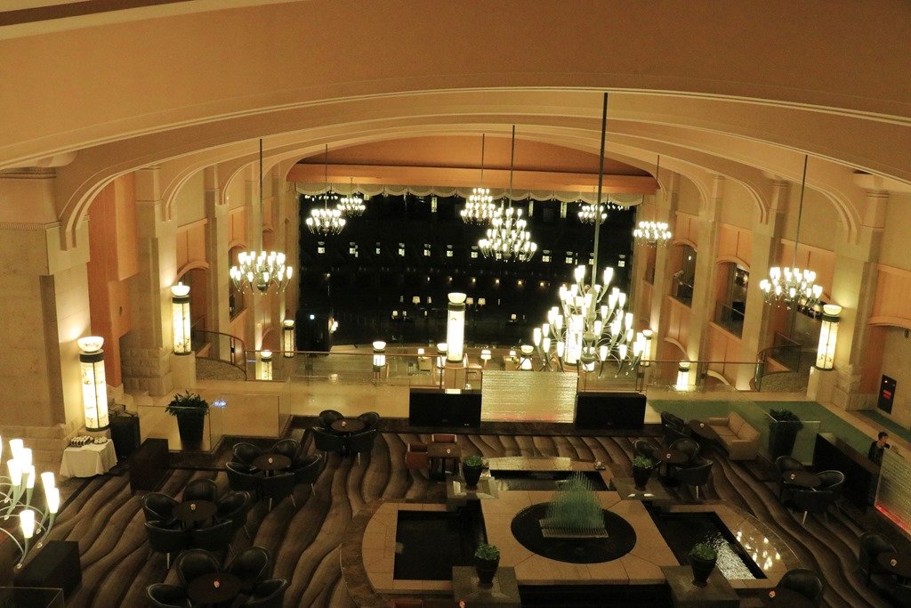 渡り廊下から見る夜のロビー
