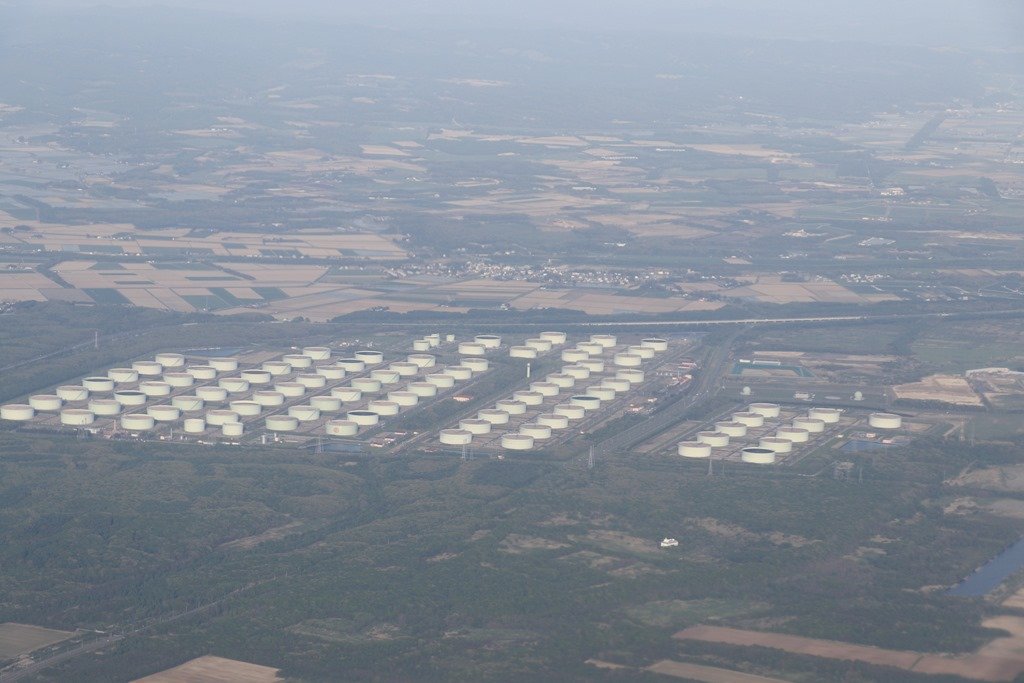 苫小牧の重油備蓄タンクです。空から見ると小さいですがタンクの直径は82mで大型旅客機がすっぽり入ります。