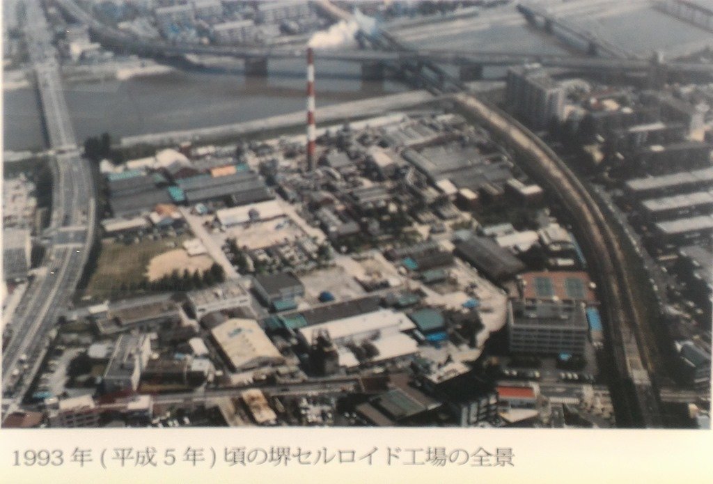 1948年(明治41年)三井家出資の堺セルロイド株式会社、三菱(岩崎家)、岩井商店、鈴木商店(幻の商社)が出資し国産セルロイド製造会社・大日本セルロイド(現:ダイセル)本社堺工場がつくられました。