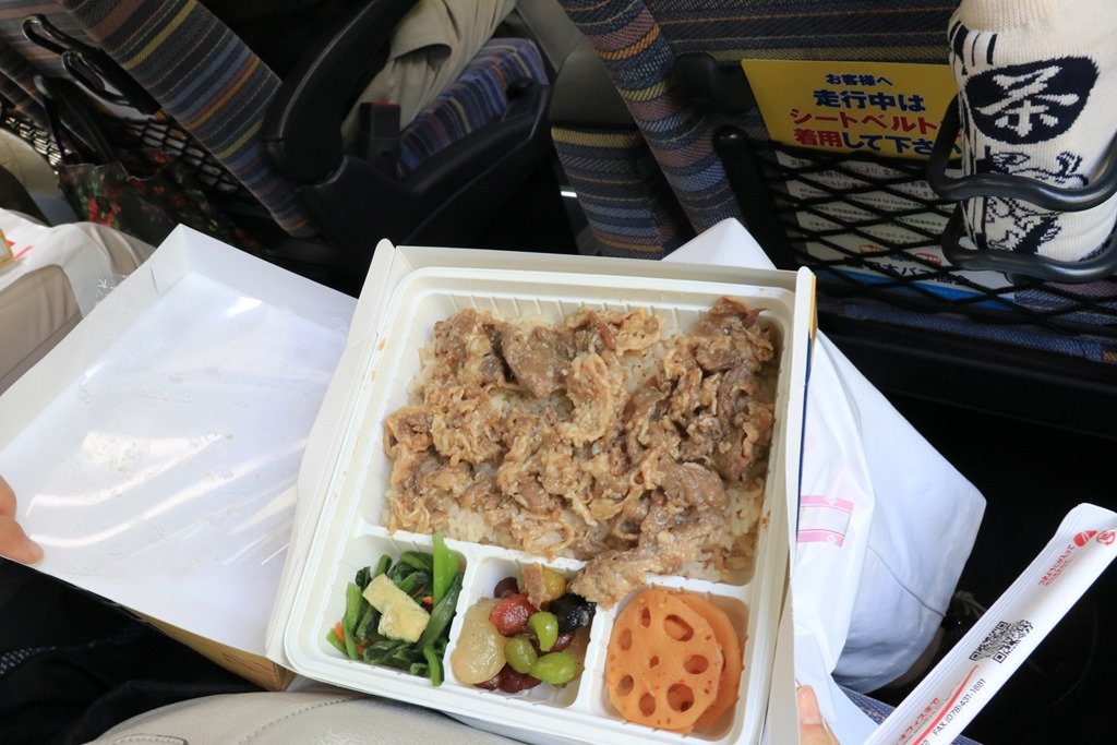 伊丹空港を出てお昼はバスの中で「すきやき弁当」でした。