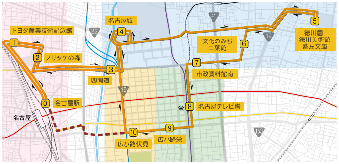 名古屋城正門を出て、名古屋の名所を巡るメーグルというバスに乗りました。