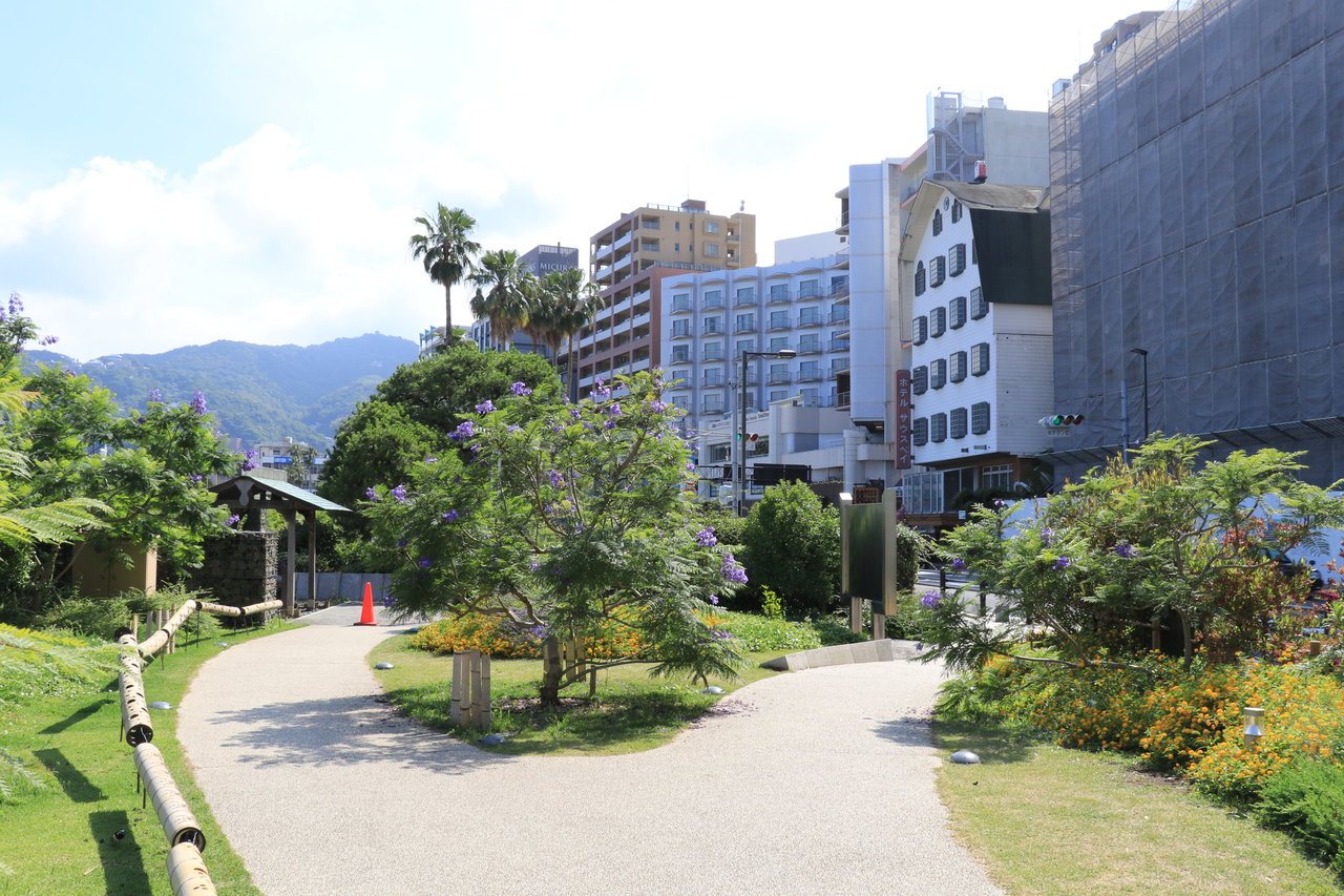 紫の場所がジャカランダが咲いている場所、ピンクの場所がブーゲンビリアが咲いている場所です。ジャカランダ遊歩道ができたのは平成26年だそうです。